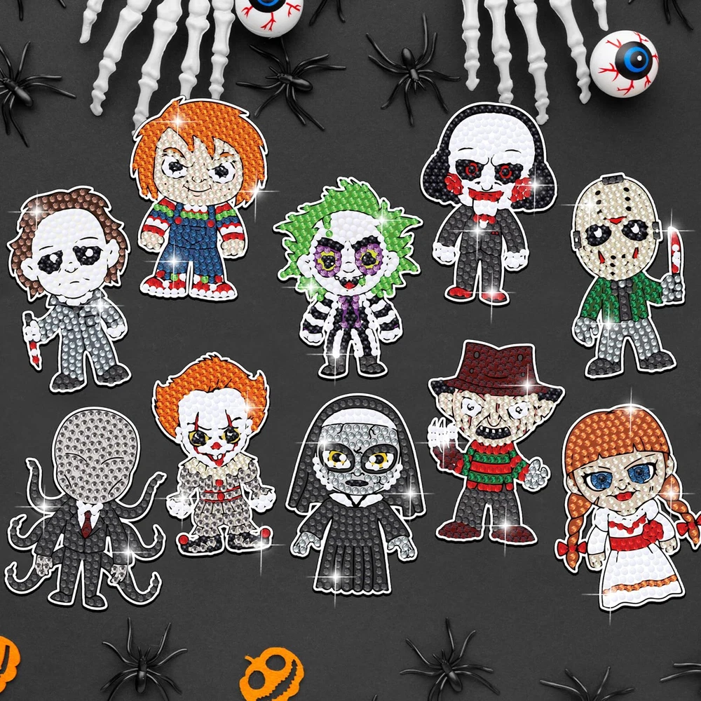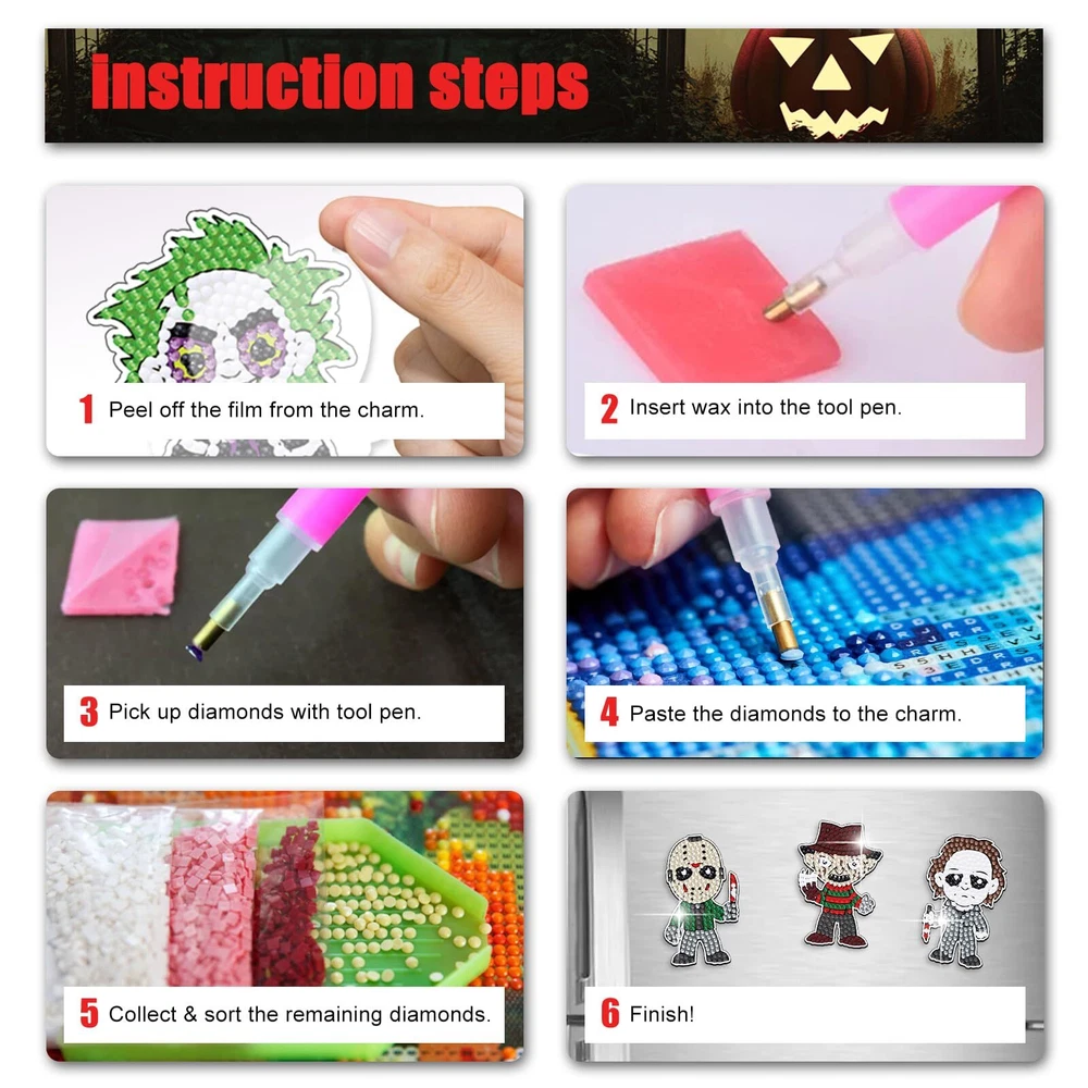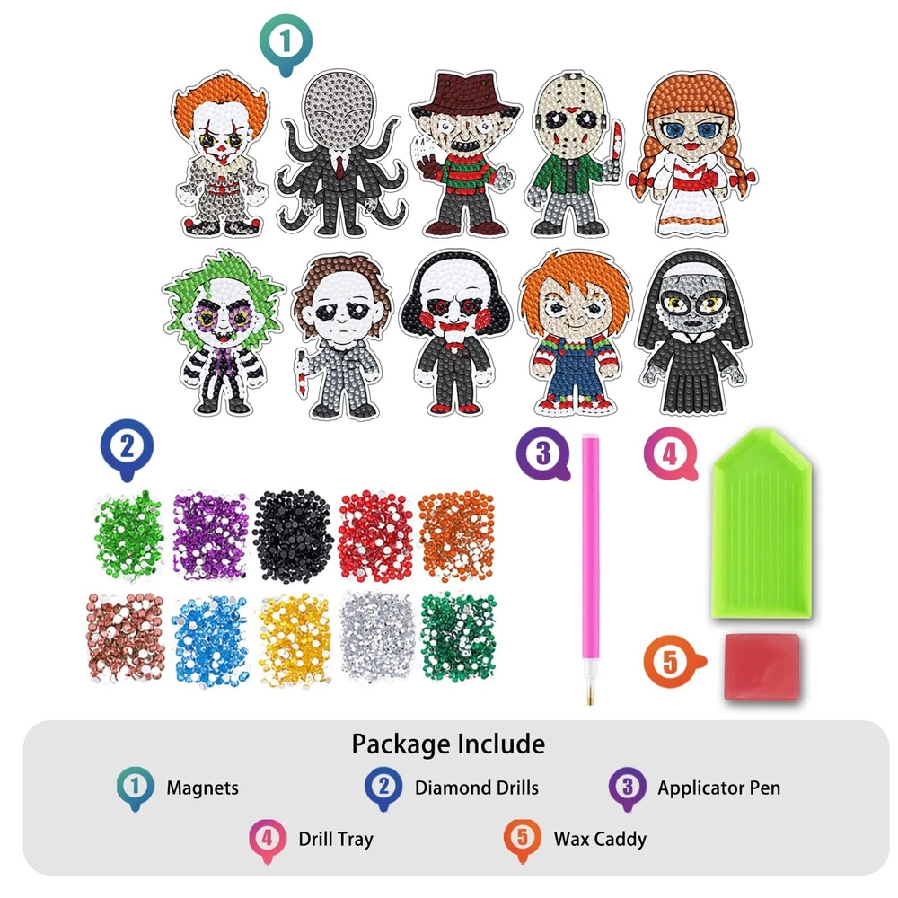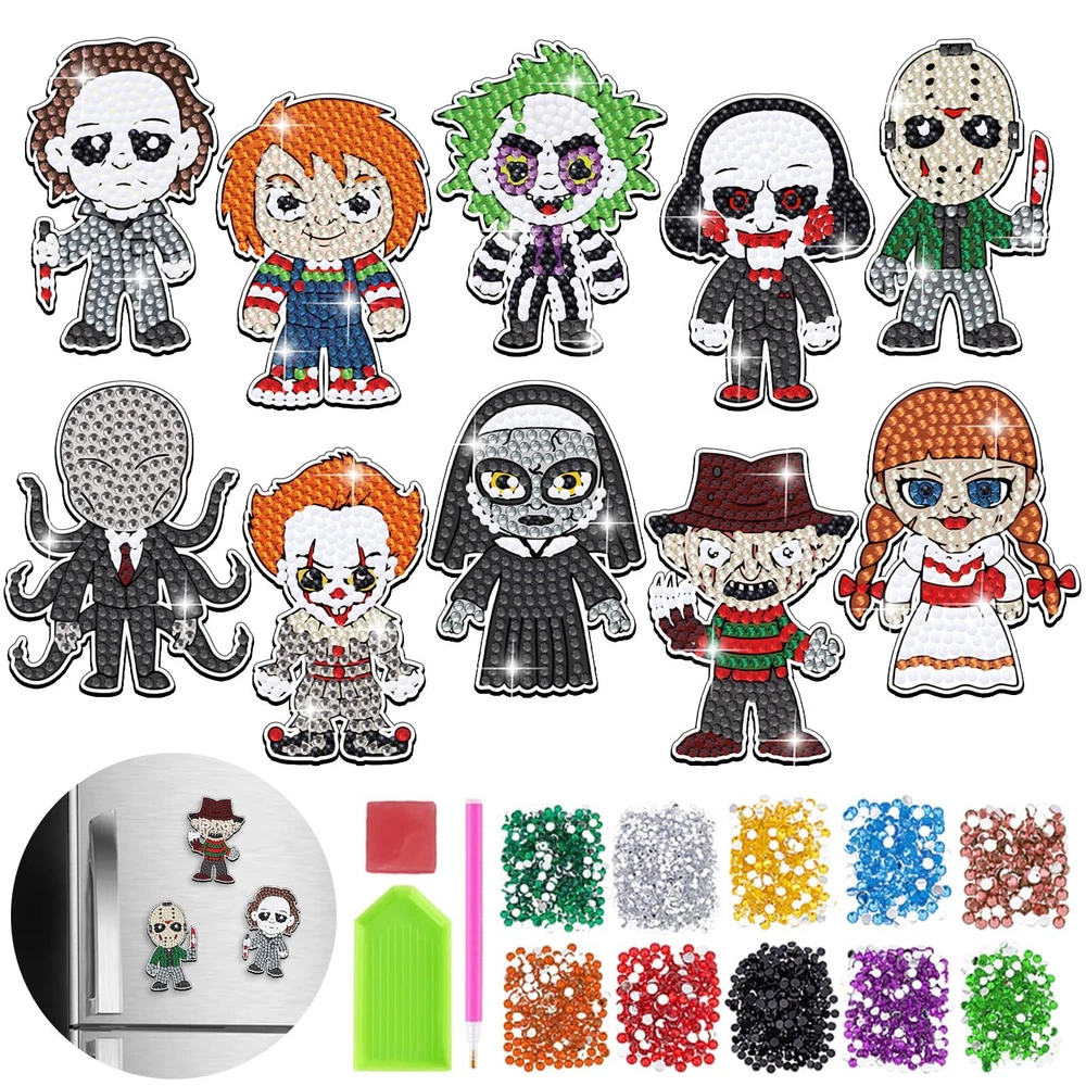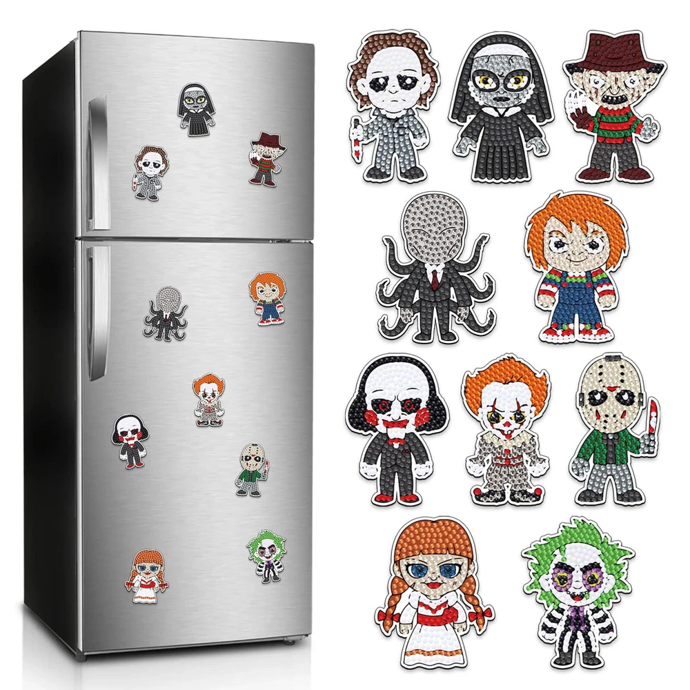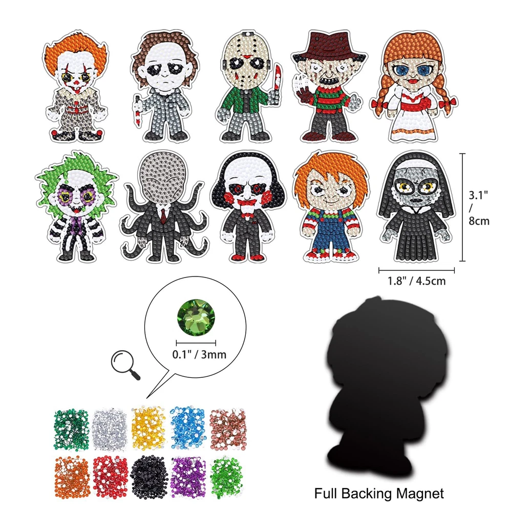 Design: This DIY diamond painting kit features a design for horror movie fans. With the spooky characters, it offers a thrilling and immersive experience for those who love the genre. Size: Each magnet piece is about 3.1 x 1.8 inches. Each diamond drill is 0.1 inch in diameter. Materials: Made with soft magnets, this product includes shiny resin diamonds that are tough and long-lasting. Easy to Use: Whether you're an experienced diamond painter or a beginner, this product is simple to use. The pack comes with a basic tool kit. The magnetic canvases are pre-printed with marks, and the diamonds are color-coded and labeled, so you'll know exactly where to place each one. Idea: Whether you're looking for something for birthday or Christmas, or simply need some creative activity for your leisure time, or a decoration for your kitchen and refrigerator, this kit is the choice. It's an engaging activity for your whole family to enjoy.
