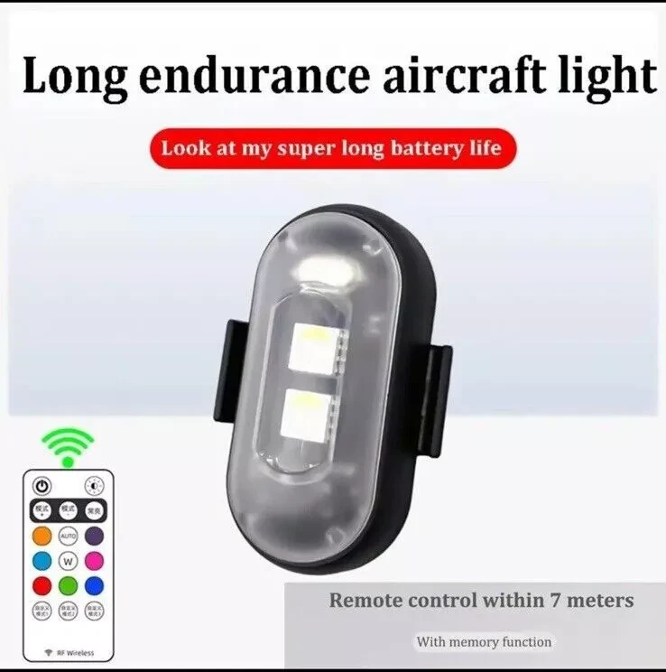 RGB Led Aircraft Strobe Lights Motorcycle Lights LED Flash Position Wireless Light Aircraft Airplane Helicopter Warning Lights Features: 7 kinds of lighting colors: white, red, green, blue, yellow, purple, sky blue. Long (2 seconds) to the machine, short to adjust the mode. MultipleModes for your choose: Seven-color fast flashing, seven-color slow flashing, seven-color mode, seven-color always-on, aviation mode, cycle mode, etc. Thirty modes with memory function. Using high-quality high-brightness multi-color wicks, high-brightness lamp beads enhance driving warnings, and are not afraid rear-end collisions High light lamp beads,better for warning function,super bright even at daytime. Widly applications,suitable for drones, traversing aircraft, fixed-wing, helicopters, motorcycles, etc. Product Description: RGB Led Aircraft Strobe lights Motorcycle Lights LED Flash Position Wireless Light Aircraft Airplane Helicopter Warning Lights Material: Plastic Color: as the picture shows, (Due to the difference between different monitors, the picture may have slight color difference. please make sure you do not mind before ordering, Thank you!) Package incldues: 10 LED Strobe Light 1 x Remote Control