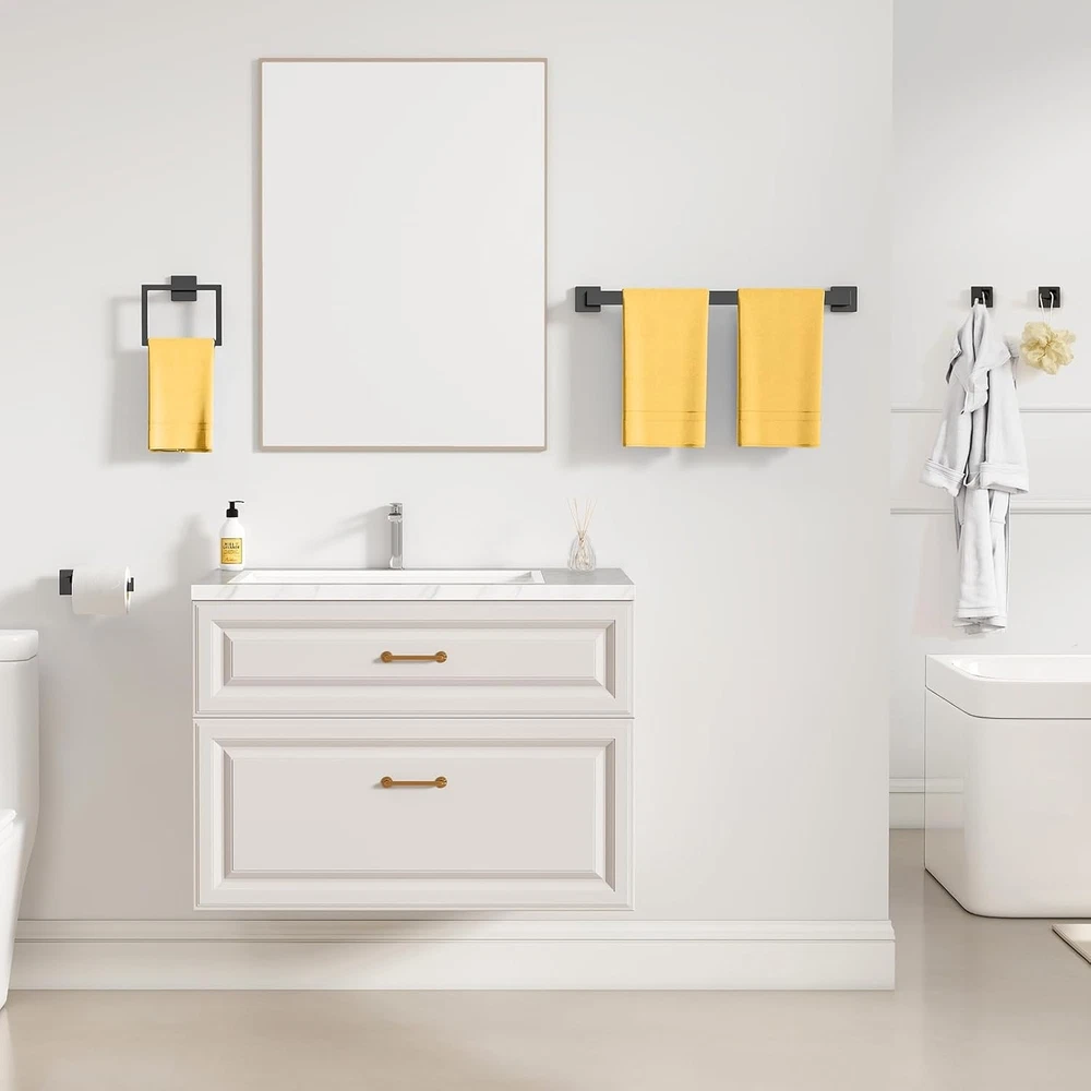 Bathroom Hardware Accessories Set, 10 Piece Black Towel Bar 24IN, Matte Product Details Color: Matte Black Material: Stainless Steel Product Dimensions: 24"L x 1.97"W x 3.3"H Finish Type: spray painting Brand: FEILERN Installation Type: Screw-In Shape: Round Manufacturer: FEILERN Item Weight: 3.99 pounds Country of Origin: China Item model number: 104073611 10-Piece Complete Set - Includes 2x24" towel bars, 2 Towel rings, 2 Toilet paper holders & 4 Towel hooks - No piece goes unused in this perfectly coordinated collection Stainless Steel Build - Bathroom Hardware set Engineered with high-grade stainless steel that resists corrosion and rust, ensuring your towel holder stays pristine for years. Hassle-Free Installation - Comes with all necessary screws and a detailed instruction manual for quick mounting. The discreet screw design keeps your walls looking flawless Versatile Use - The black bathroom accessories set complements any space - perfect for bathrooms, outdoor showers, kitchen cabinets, laundry rooms Keep Tidy:Bathroom set towels and toilet paper holders with easy access, perfect harmony with your black bathroom fixtures