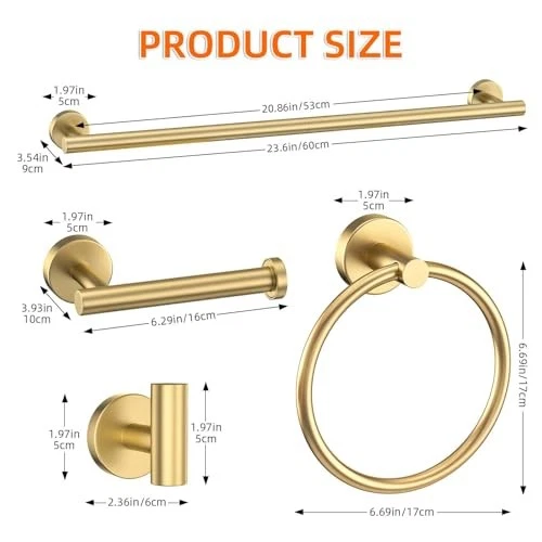 Return Policy Fast Delivery Trusted seller 10-Piece Bathroom Hardware Accessories Set-Brushed Gold Towel Bar&Holder Set,SUS304 Stainless Steel Towel Rack Set-Wall Mounted,23.6-Inch Product Description This brushed gold bathroom hardware set is made of high-quality SUS304 stainless steel to prevent rust and corrosion and is durable This bathroom accessories set contains two 23.6-inch towel bars, two towel rings, two toilet paper holders, and four towel hooks. This bathroom accessories set can meet all your needs in daily life and match your bathroom equipment perfectly This towel rack contains all the hardware and screw accessories required for installation. We provide detailed installation instructions to make installation quick and easy This round towel bar set is designed with simple lines. It can match any home decoration and style. It is the perfect accessory for your bathroom This bathroom towel rack set is perfect for bathrooms, powder rooms, laundry rooms, kitchens, and even outdoor showers. This bathroom set provides efficient storage functions to create a neat and organized bathroom space If you have any questions about the product, please feel free to contact us and we will definitely help you solve it Shipping Returns Payment Shipping Shipping is FREE to all addresses other than APO/PO boxes in the lower 48 states. All our stock ships from US-based warehouses. Shipped via USPS or UPS (depending on location and package weight) Unless stated otherwise, all orders will ship within 24-72 hours of your payment being processed. Check our feedback to see the great reviews of FAST shipping we offer. Returns Seller does not accept returns Payment We currently accept payment via eBay managed payments only. Once payment is cleared, we will dispatch your shipment within 1-3 business days. Please refer to the "Shipping" tab for more information regarding shipping speed to your destination.