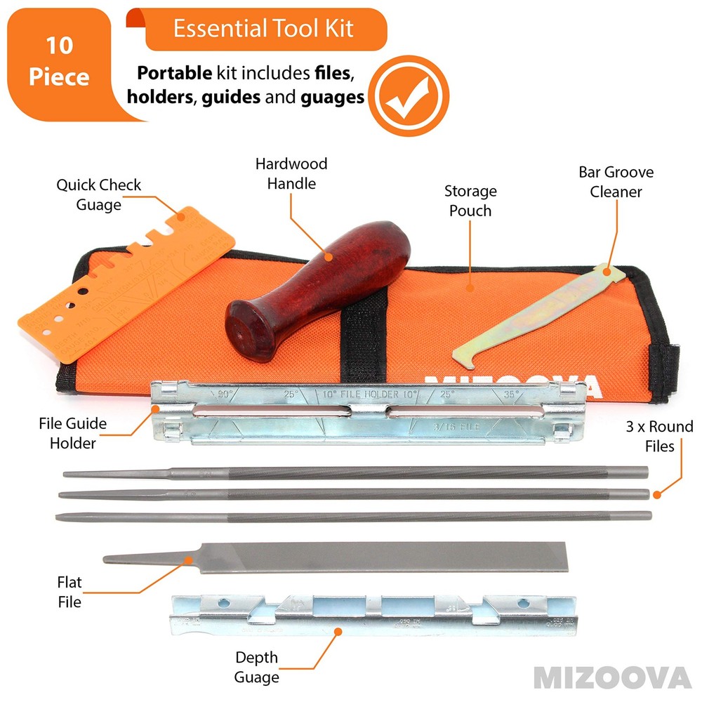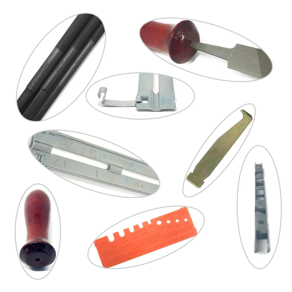 10 piece chainsaw sharpening kit, sharpens chain blades quickly, affordably and effortlessly Durable 5/32, 3/16, 7/32 inch round files, can be used on a wide variety of chain types and pitch File guide with quick lock and release mechanism; engraved angles help with alignment when filing Includes: 3 files, file holder, flat file, depth gauge, bar groove cleaner, quick check gauge, pouch Measures 11.02 x 3.15 x 1.18 inches; Weighs 13.4 ounces