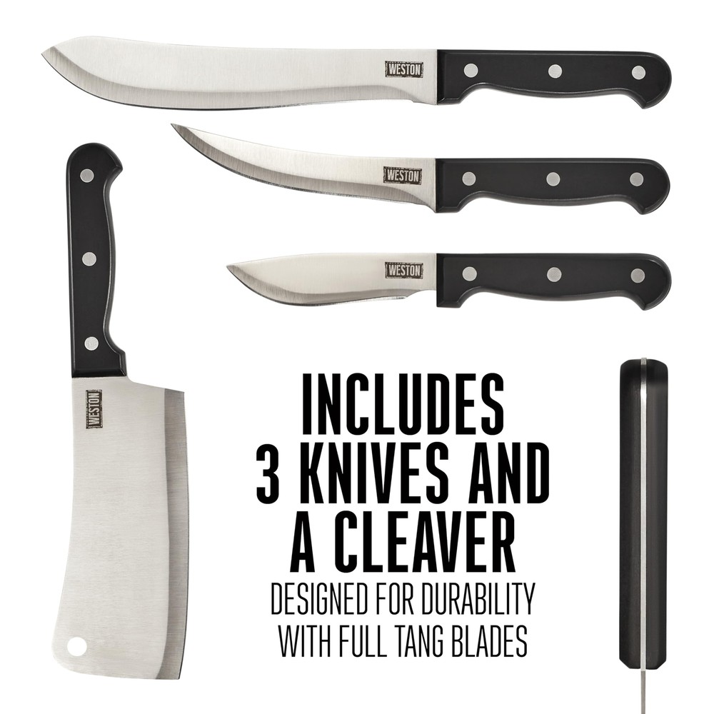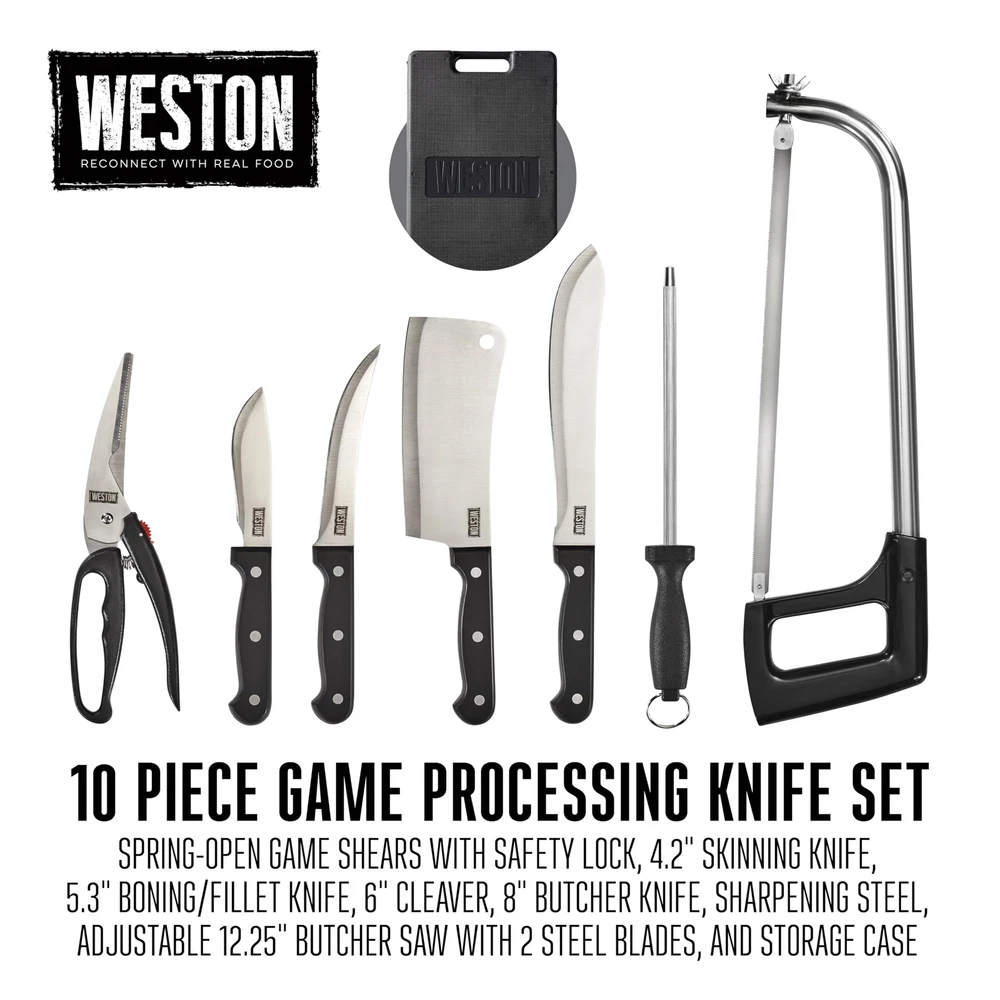 The ® 10 Piece Game Processing Knife Set has everything you need to process game in the field or at home: butcher knife, cleaver, boning/fillet knife, skinning knife, butcher saw with 2 blades, sharpening steel, game shears, and storage case. 83-7001-W, 10 piece processing knife set has durable stainless steel blades and riveted handles. This set includes: 8-inch butcher knife, 6.5-Inch cleaver, 5.75-Inch boning and Fillet knife, 4.25-Inch skinning knife, adjustable 12.25-Inch butcher saw, 2 steel butcher saw blades, game shears with spring open and safety lock, steel for sharpening knives and plastic storage case. Complete 10 piece set. The set comes with everything you need to process game: 8" butcher knife, 6" cleaver, 5.3" boning/fillet knife, 4.2" skinning knife, adjustable 12.25" butcher saw with 2 blades, sharpening steel, game shears, and storage case. Includes 3 knives & cleaver designed for durability. The game processing kit's cleaver and knives are made of rust-resistant, 420 stainless steel with full tang blades for increased balance/leverage. Ergonomic handles for stability & control. The knives and cleaver in the hunting knife set have ergonomic handles for more stability and control when processing fish, poultry, rabbits, deer and other game. The handles are riveted for extra strength. heavy duty game shears. The heavy-duty, spring-open game shears have a bone-breaking notch and a safety lock. They're great for processing small game and poultry. Portable and hard-sided storage case. The durable, hard-sided case with built-in handle holds all the pieces of the outdoor knife set so you can easily carry the set into the field, on your boat, or anywhere you need to process game or fish.