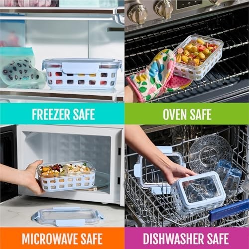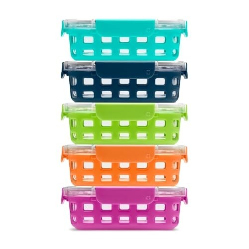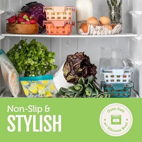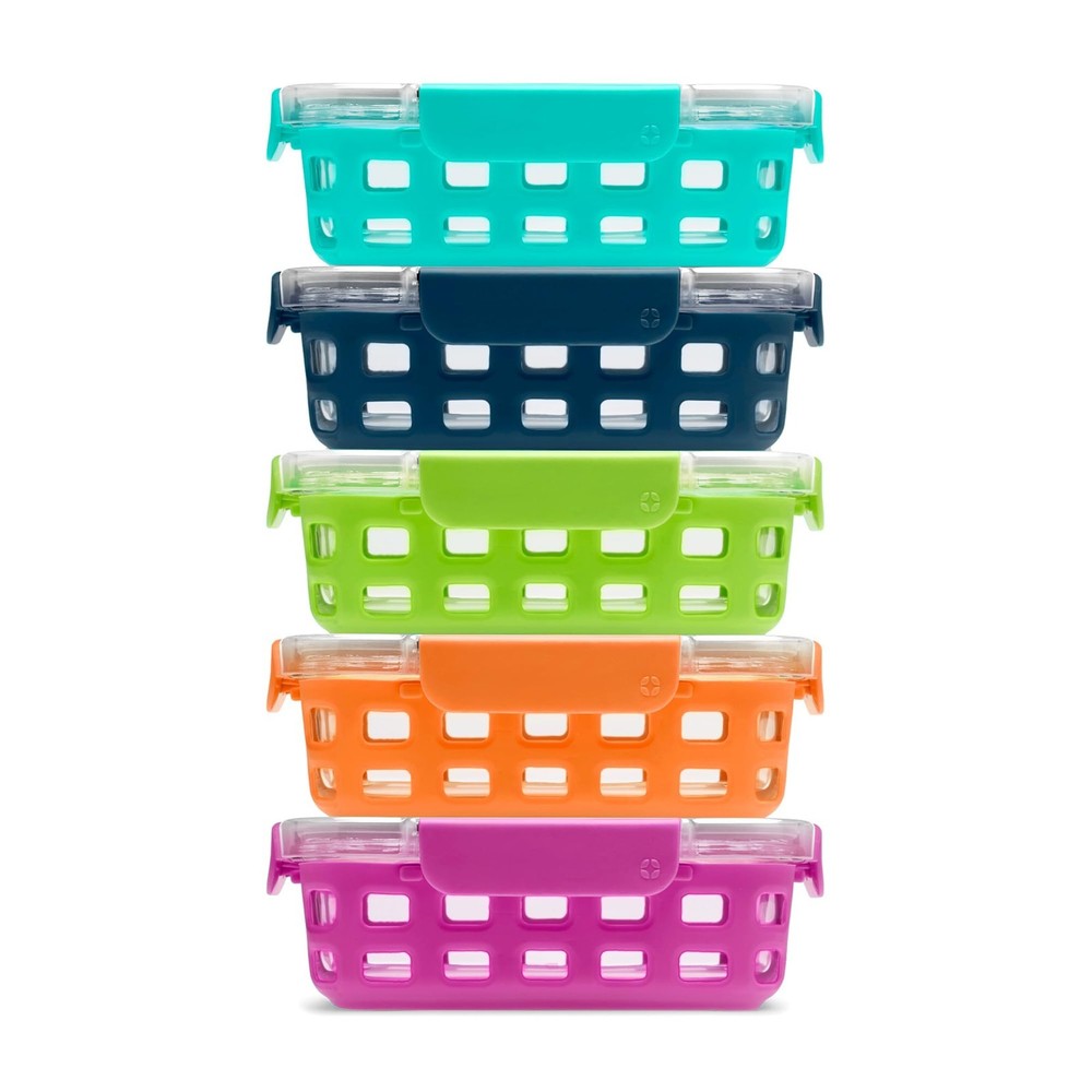 5-Pack Meal Prep Containers Experience the ultimate in food storage with our 10-piece Meal Prep Food Storage Containers set. This collection includes: Five 3.4 Cup Glass Containers: Perfect for portion control and meal prepping. BPA-Free Plastic Locking Lids: Designed to keep your food fresh for longer. DuraGlass Technology Our DuraGlass containers are crafted from high-quality tempered glass, ensuring: Stain and Odor Resistance: No more scrubbing to eliminate stubborn stains and smells. Leak-Proof and Airtight The snap-on airtight lids provide: No Spills: Keep your meals secure during transport. Longer Freshness: Maintain the quality of your food. BPA-Free Safety: Safe for your family and the environment. Freezer and Dishwasher Safe: Convenient cleaning and storage options. Easy to Use These containers are designed with your convenience in mind: Oven and Microwave Safe: Heat your meals without the lid. Freezer Safe: Store leftovers with ease. Top Rack Dishwasher Safe: Hassle-free cleaning—no need to remove the sleeve. Meal Prep in Style Add a splash of color to your kitchen with our removable extra thick silicone protection sleeve, which offers: Variety of Colors: Make meal prepping fun and stylish. Protection Against Chips and Breaks: Keep your containers