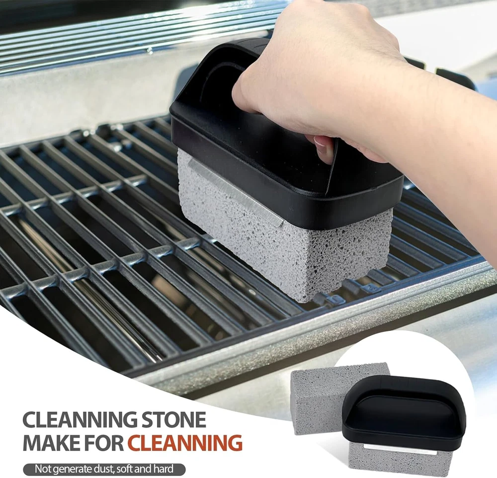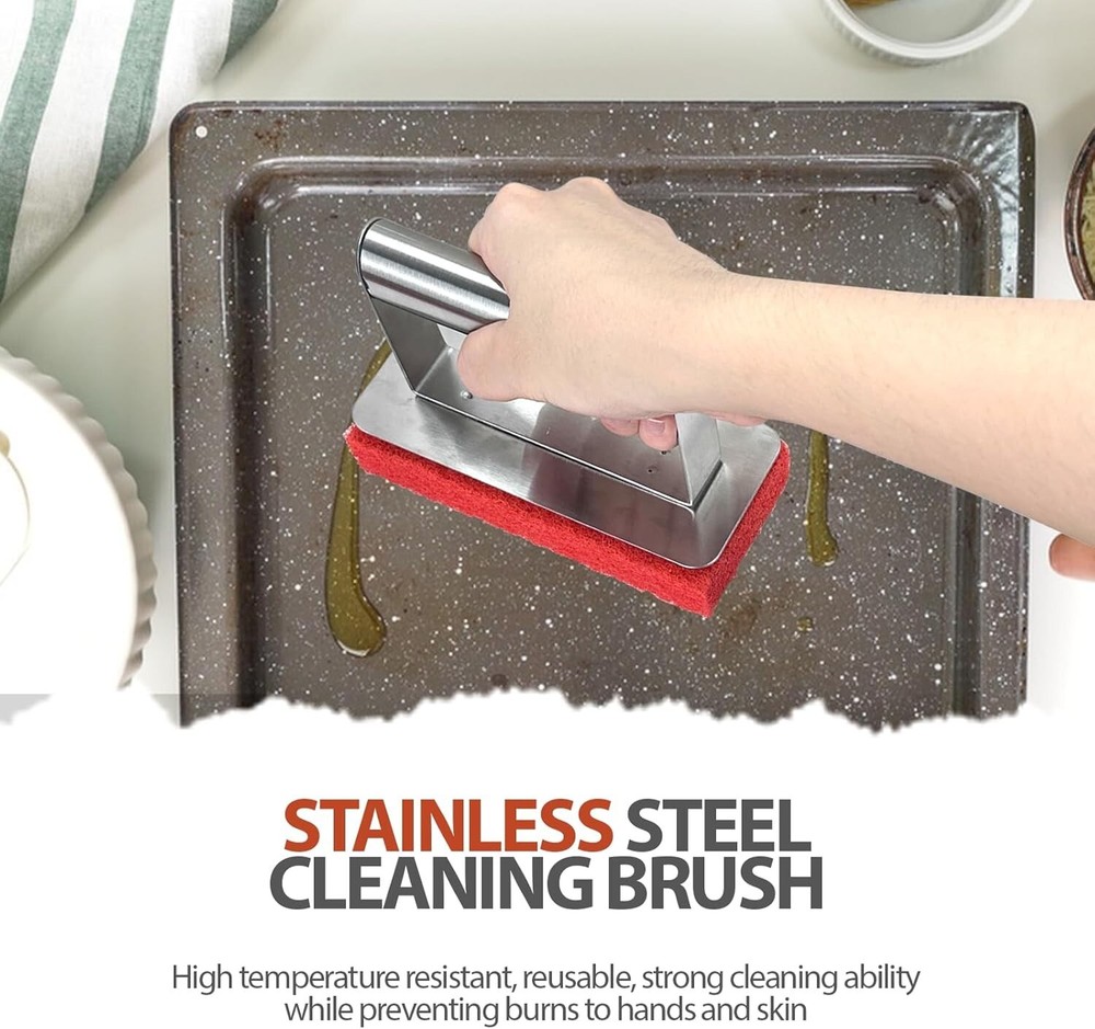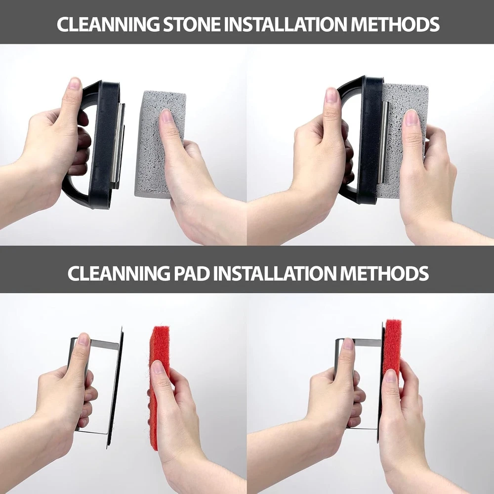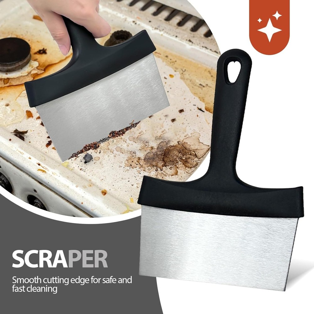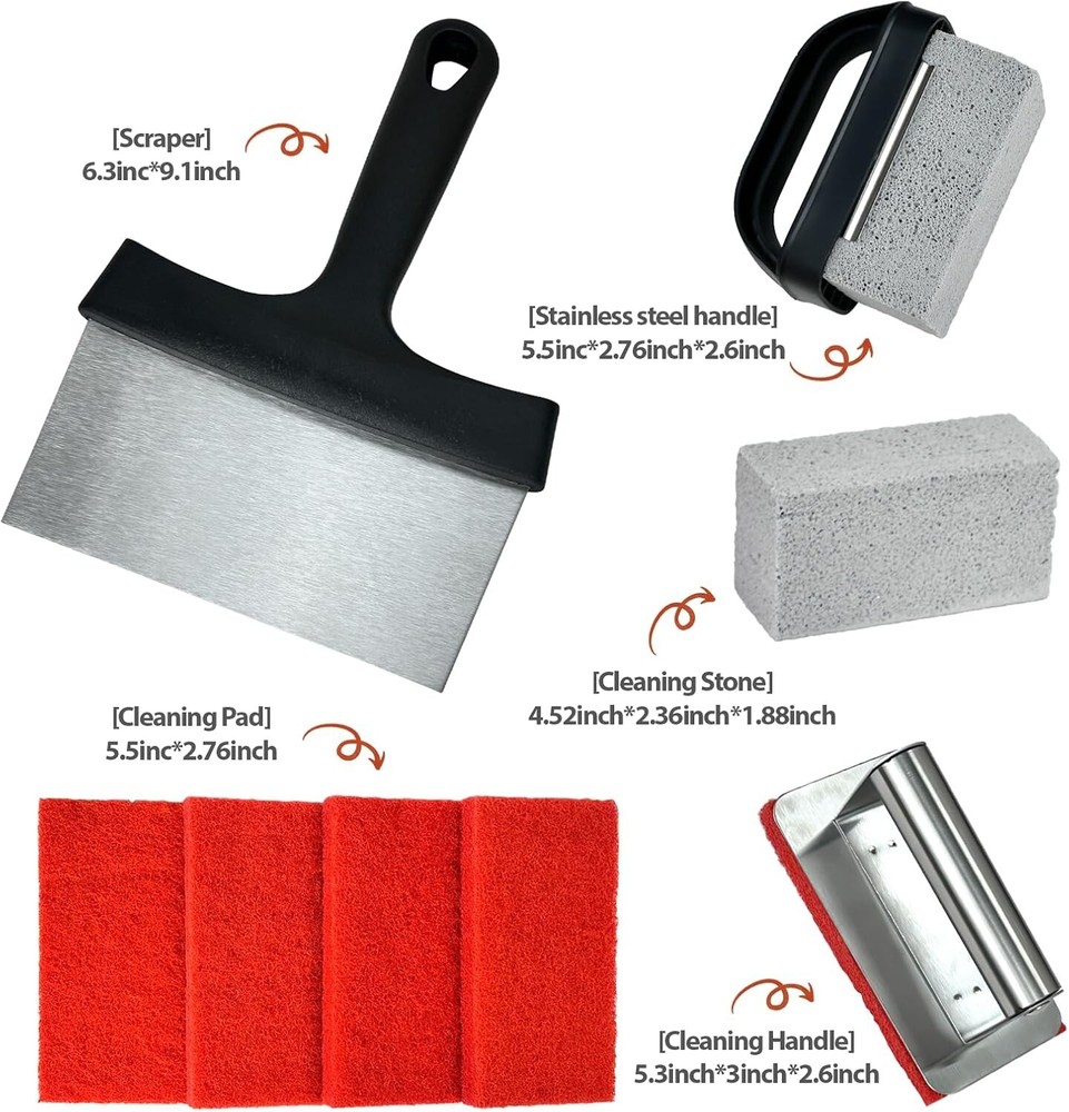 Griddle Cleaning Kit, 10 PCS Heavy Flat Top Grill Cleaner Tool Set includes 2 Handles, 1 Griddle Scraper, 2 Grill Stone, and 5 Griddle Brush, Professional Grill Accessories for Black-stone Deep 【BLACK-STONE CLEANING KIT】Make grill cleaning a breeze with this Black-stone griddle cleaning kit which includes 2 handles, 1 griddle scraper, 2 grill stones, and 5 griddle brushes. Get everything you need for a sparkling clean grill! 【DEEP CLEANING】 Restore your grill to its former glory with a deep cleaning. The grill stone and scraper work wonderfully to clean any stains, residue, encrusted grease, burnt food particles, etc. It is effortless and leaves no scratches! 【PREMIUM QUALITY & VERSATILITY】Crafted from premium materials, this grill cleaning kit is rust-resistant, heat-resistant, and dishwasher-safe. It's perfectly suitable for both newbies and professionals. You can use the grill scrapers for a variety of tasks, e.g. for quickly removing crumbs, turning food, and chopping food. 【SAFE & DURABLE DESIGN】Our Black-stone cleaning kit is designed for heavy-duty use. Ergonomically shaped plastic handles provide additional safety and protection, preventing burns during cleaning. They are easy to attach and remove, so you can easily control your cleaning tasks on hot or cold surfaces. 【PROTECT YOUR GRILL FLAT TOP】Specially developed for flat top grills, our grill stones won't scratch the metal surfaces and extend the life of your Black-stone grill. Keep your grill looking like new with our comprehensive cleaning kit!