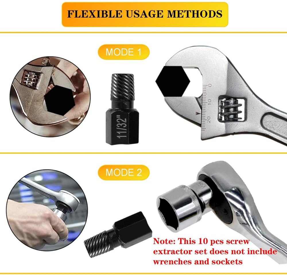 This screw extractor set is a lifesaver for stripped or broken bolts! The hex head design gives a solid grip, and the multi-spline teeth bite into damaged screws effortlessly. The 10-piece variety covers different sizes, making it super versatile. Easy to use with just a wrench—no batteries needed. Compact and well-made, it’s a must-have for any toolbox. Saved me hours of frustration!