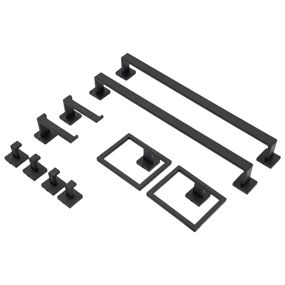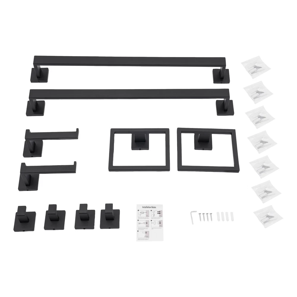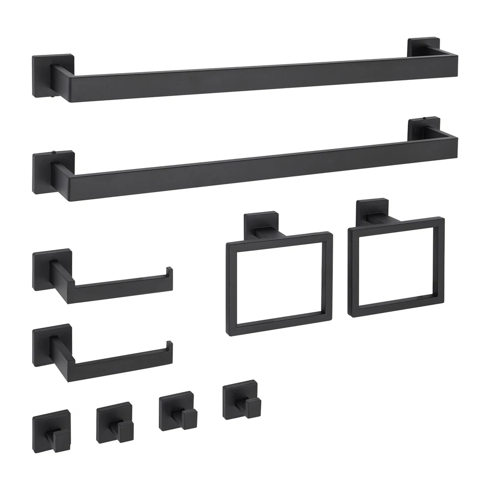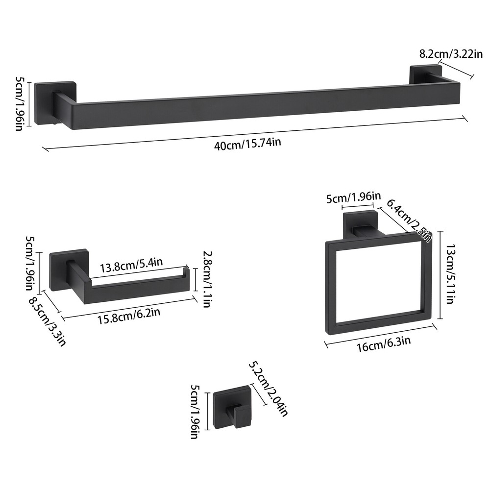 10-piece Matte Black Bathroom Accessories Set Wall Mounted Bathroom Towel Bars Description This 10-piece matte black bathroom accessories set, with elegant lines in your bathroom space, is not only a practical choice for daily use but also a delicate display of home taste. Selected 201 stainless steel material, it is durable and easy to maintain, so that every touch becomes enjoyable, adding a calm and cozy to your life. Key Features Premium Material: They are made of high-quality 201 stainless steel with a spray coating surface, which can prevent rust and corrosion, and can guarantee performance and aesthetics when placed in the bathroom for a long time. 10 Pieces Combination: The set includes 2 x 15.75in towel bars, 2 x towel rings, 2 x toilet paper holders, and 4 x towel hooks, which can effectively meet the needs of towels and toilet paper in your bathroom, and reduce the necessity for you to buy extra. Understated Beauty: The classic black color can be adapted to a variety of bathroom styles, in addition to the unique matte surface can also add a sense of understated luxury to the bathroom. Stable Support: 1.97*1.97in base and perforated mounting allows our towel bar, towel ring, toilet paper holder, and towel hook to hold a stable 22.05lbs each, so you can use it with peace of mind. Life Assistant: With this bathroom set, you and your family can conveniently access towels, washcloths, toilet paper, etc. while keeping items hygienic and tidy. Easy to Clean: The smooth, matte surface can greatly reduce the traces of fingerprints and water stains, and the simple structure is also convenient for you to remove dust and stains with a damp rag. Simple to Install: We provide complete screw fittings and an installation instruction for installation, so you can complete the installation quickly and independently. Customer Service: We aim to provide quality products and services. If you have any problems, please feel free to contact us. We will reply and solve the problem for you as soon as possible. Details Thoughtful Grooves: The toilet paper holders are specially designed with grooves to hold the toilet paper in place better and allow for smoother access. Rounded Corners: Smooth and burr-free corners can greatly enhance safety and aesthetics during installation and use. Application It can be installed in bathrooms, homes, hotels, restrooms, shopping malls, etc. to hold towels, toilet paper, and other household items. Specification Material: 201 Stainless Steel Process: Spray Coating Color: Matte Black Assembly Required: Yes Mount Type: Wall Mounted Installation Method: Perforated Installation Each Load Capacity: 10kg/22.05lbs Each Towel Bar Size: 40*8.2cm/15.75*3.23in Each Toilet Paper Holder Size: 15.8*8.5*5cm/6.22*3.35*1.97inch Each Towel Hook Size: 5*5*5.2cm/1.97*1.97*2.05in Each Towel Ring Size: 16*13*6.4cm/6.3*5.12*2.52in Each Base Size: 5*5cm/1.97*1.97in Package Size: 62.5*25.5*7.5cm/24.61*10.04*2.95in Gross Weight: 2kg/4.41lbs Package Included 2* Towel Bars 2* Toilet Paper Holders 2* Towel Rings 4* Towel Hooks 1* English Instruction All Accessories for Use Notes Please check the style and size before purchasing. Please follow the diagram for installation. Please use a drill bit that matches the size of the screw to drill the hole. Otherwise, it will result in failure to fix the base. Please note that this product does not contain towels, toilet paper, etc. Please allow the slight color difference caused by the shooting light and 1-3cm error due to manual measurement and make sure you do not mind before ordering. Payment Delivery details Terms of sales About us Contact us Payment We accept ebay payment 。 Fees such as import duties, taxes are not included in the item price or shipping costs. These charges are the buyer's responsibility. Delivery details Shipping: 2-9 working days to: USA Terms of sales We maintain high standards of excellence and strive for hundred percent customer satisfaction. Feedback is very important to us. We hope that you contact us immediately before you give neutral or negative feedback, so that we can address your concerns. It is impossible to address issues if we do not know about them! About us Your satis faction is our ultimate goal. We work hard to earn your trust and future business. Our certified technicians have tested each item before shipping. The unit comes with 1 year limited warranty on all manufacturing defects. a) If you receive a defective item, you may return it or ask for a discount. Please contact us within 14 days after you receive the package. b) What you returned must be intact and in its original packaging as re? u. Customer is responsible for shipping costs of the returned item. c) We will cover the cost of shipping back t with the shipping rate indicated in the registration page. We will send you a new unit or refund the full payment you paid. Thank you. Contact us Business Hour Business Hour: Monday To Friday: 8:30 AM to 5:00 PM (Beijing China time) Due to time zones, our reply to your questions may not be immediately. But within above working time, we will reply your email within 24 hours. If it's non-workdays, please kindly be patient and wait till Monday. Please contact us with ebay message. Please feel free to contact us if you have any questions. Monday To Friday: 8:30 AM to 5:00 PM (Beijing China time) Due to time zones, our reply to your questions may not be immediately. But within above working time, we will reply your email within 24 hours. If it's non-workdays, please kindly be patient and wait till Monday. Please contact us with ebay message. Please feel free to contact us if you have any questions. Color Matte Black Brand Unbranded Material 201 Stainless Steel Process Spray Coating Assembly Required Yes Mount Type Wall Mounted Installation Method Perforated Installation Each Load Capacity 10kg/22.05lbs Each Towel Bar Size 40*8.2cm/15.75*3.23in Each Toilet Paper Holder Size 15.8*8.5*5cm/6.22*3.35*1.97inch Each Towel Hook 