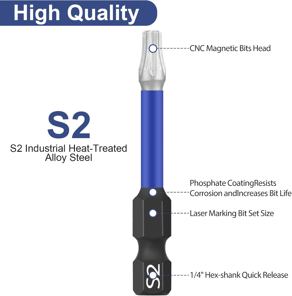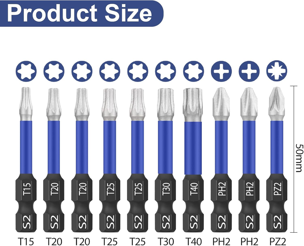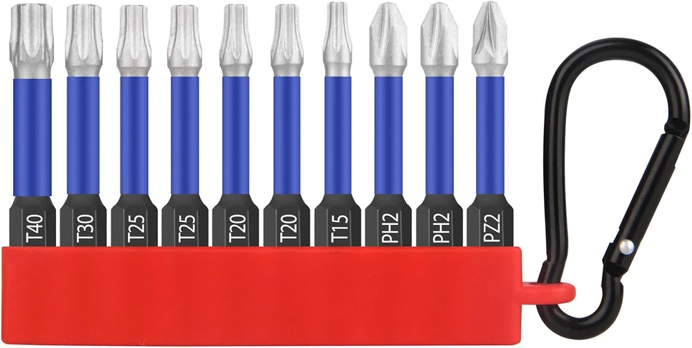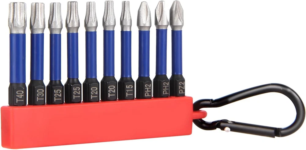 【Hex Bits Set In Multiple Sizes】The 10 Piece Screwdriver Bit Set Includes: T15 x 1 / T20 x 2 / T25 x 2 / T30 x 1 / T40 x 1 / PH2 x 2 / PZ2 x 1, Length 50mm, with Key Ring, Easily Meets Your Needs. 【High Quality Materials】Shockwave Bit Set Made of High-Quality S2 Chrome Vanadium Steel, CNC Machined Tips, Two Colors Phosphate Coating is Corrosion Resistant and Increases the Life of The Bits, Strong Rust and Corrosion Resistance, The High Temperature Quenching Treatment Improves Durability and Service Life. 【Easy To Use】Quick Release Wrench with 1/4 Inch Hex Shank, for Quick Change and All Cordless Screwdrivers. Easy to Install and Disassemble, Not Easy to Fall off During Use. 【Special Design】Reinforced Magnetic Impact Drill Makes It Easier to Pick Up Screws. The Magnetism Does not Wear off After Repeated Use. 【Wide Application】Suitable for Household DIY Work, Woodworking, Automobiles, Professional Machine Repair, etc. Widely Used with This Hex Bit Set for Air Screwdrivers, Electric Screwdrivers, Hand Screwdrivers, etc. Such as Bosch, Milwaukee, DeWalt, Metabo etc. HPHOPE Professional Screwdriver Bit Set 10Pcs, Shockwave Bit Set Includes Torx Bits, Pozi Bits, Phillips Bits, Length 50mm, Hexagon Bits Set with Key Ring