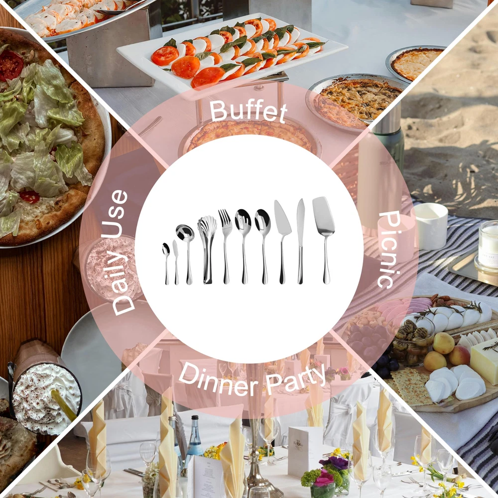 【High Quality Material】This stainless steel serving utensil set is made from food grade stainless steel which is durable and rust resistant. The metal layer adopts vacuum plating technology to keep you and your family away from the worries of peeling paint and discoloration. 【Great Value Serving Utensils Set of 10】In this pretty serving set you will get 1 Serving Tong, 1 Slotted Serving Spoon,1 Serving Spoon,1 Serving Fork,1 Soup Ladle,1 Pie Server,1 Butter Knife,1 Sugar Spoon,1 Cake Knife,1 Lasagna Server. A variety of serving utensils can almost meet your daily and party needs, the quality is much more better than plastic utensils, affordable and reusable. 【Dishwasher Safe】This stainless steel serving utensil is easy to clean, dishwasher safe and hand washable. Proper maintenance can help extend the lifespan and keep your silverware looking as shiny as new. 【Suitable Size,Well-Made】The serving utensils set is just the right size, perfect for portioning out from smaller containers, allowing you to enjoy delicious meals with friends and family.High quality food grade stainless steel can stand up to everyday use, sturdy and durable, not easily rusted or bent, resistant to high temperatures; smooth and textured edges, no rough spots or cracks. 【Lifetime Support】: If you have any questions about our fork set, please contact us and we will solve it for you within 24 hours.