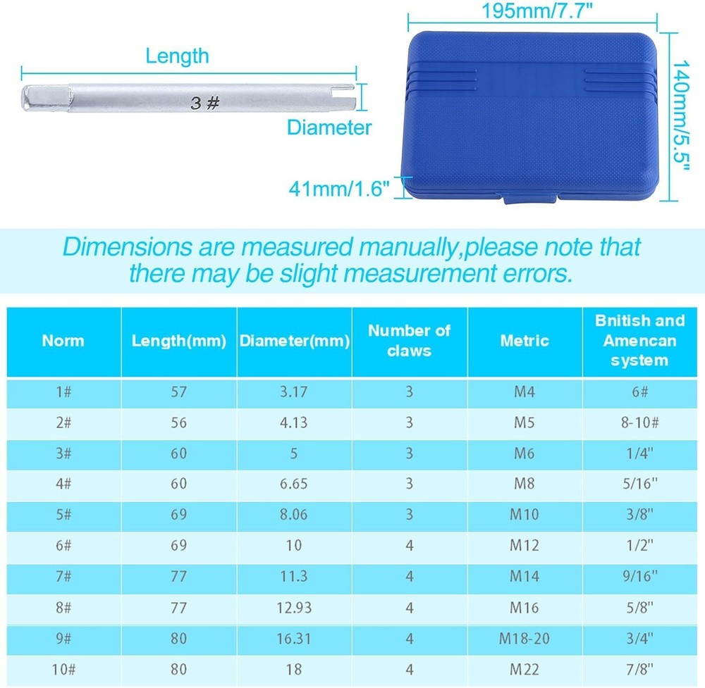 10 Pcs Tap Extractor Set 3/4 Flute Broken Head Screw Remover Stripped Tap Ext... Premium Material: Made of high-hardness Chrome-molybdenum steel with anti-rust electroplated surface for high torsional strength and ensuring long-lasting performance. 3/4 Flute Specification: 1#: 3 flute, M4, 6#; 2#: 3 flute, M5, 8-10#; 3#: 3 flute, M6, 12#-1/4; 4#: 3 flute, M8, 5/16"; 5#: 3 flute, M10, 3/8"; 6#: 4 flute, M12, 1/2"; 7#: 4 flute, M14, 9/16"; 8#: 4 flute, M16, 5/8";9#:4 flute, M18-20, 3/4"; 10#: 4 flute, M22, 7/8". Precision Size: There are 10 sizes of tap extractors, 1#-5# are 3 flutes, and 6#-10# are 4 flutes, featuring the groove structure, these tap extractors can grab broken screw taps speedily. The square head is compatible with a tap wrench or adjustable wrench. Efficient Extraction: Select the appropriate tap extractor and insert it into the tap's groove. Then, using a tap wrench or adjustable wrench, unscrew in the opposite direction. The result will be a newly restored tap thread. Wide Application: The tap extractor is specially designed for fast grasping and easy removal of stripped, rusted, broken, or corroded screw taps. It's an essential tool for industrial and home repair work. Shipping We offer FREE shipping on all orders! We ship within Three business days of payment, usually sooner. Local pickups and combined shipping options are not provided at this time. Return You can return a product for up to 30 days from the date you purchased it. Any product you return must be in the same condition you received it and in the original packaging. Please keep the receipt. Payment We accept payment by any of the following methods: PayPal Please pay as soon as possible after winning an auction, as that will allow us to post your item to you sooner! Feedback Customer satisfaction is very important to us. If you have any problem with your order, please contact us and we will do our best to make you satisfied. Contact Us If you have any queries, please contact us via ebay. We usually respond within 24 hours on weekdays. Please visit our eBay store to check out other items for sale! Thank you for shopping at our store.
