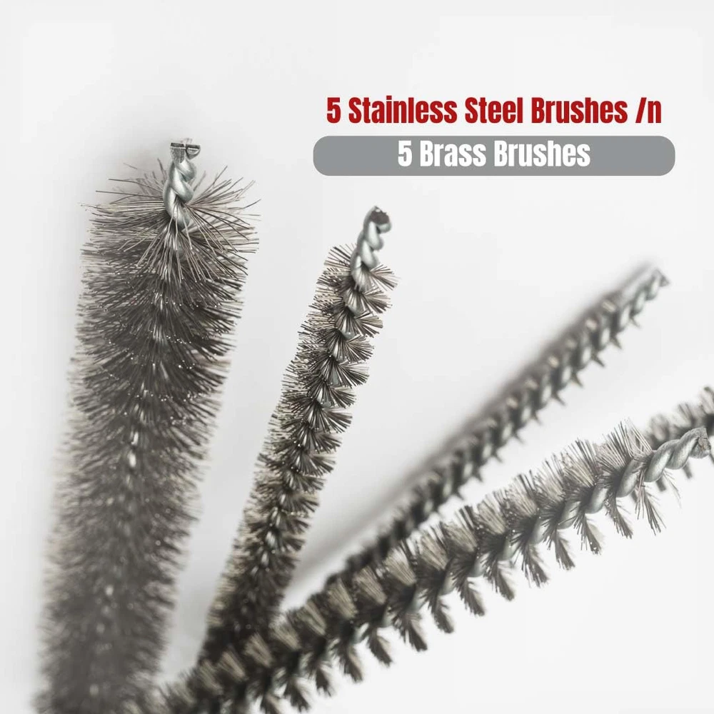 Tube Brush Kit 10 Piece Brass & Stainless Steel Bristle * Brass brushes: 1/4", 5/16", 3/8", 1/2", 3/4" * Stainless steel brushes: 1/4", 5/16", 3/8", 1/2", 3/4" * 4" long brush area * Brushes are 12" overall length * Twisted wire handle with loop Multi Size Cleaning Brush Kit: This 10-piece Tube Cleaning Brush Kit includes 5 steel wire brushes and 5 stainless steel brushes in various sizes, from 1/4" to 3/4". Ideal for engine cleaning, metal rust removal, and detailed cleaning tasks. It's your go-to set for thorough cleaning! Access Hard-to-Reach Areas: These 12" metal brushes with a 4" brush area easily clean 3/8 stainless steel tubing, tight spaces, and narrow areas. Heavy-Duty Build: Designed with twisted wire handles, flexible shaft and a storage loop, these durable metal brushes are designed for tough cleaning tasks, making them perfect for heavy-duty use. Safe and Cautious: This kit includes brushes for rust, steel, and stainless surfaces, making it versatile for various cleaning tasks. Please be careful and keep away from children. Always wear protective glasses while using these tools to ensure safety. Customer Satisfaction Guaranteed: If you have any quality issues with the product, us for a .