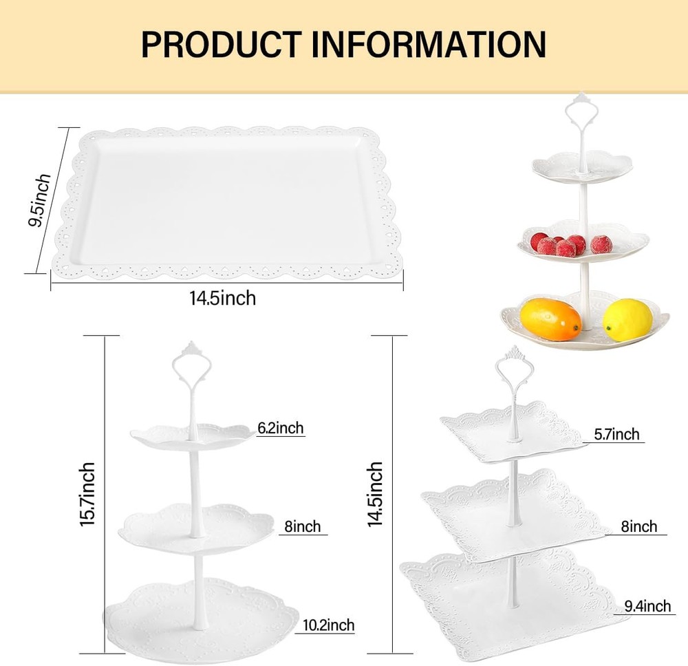 10 Pcs Cake Stand White Plastic Dessert Table Set 4 3 Tired Product Details Brand: mwellewm Color: White Material: Plastic Product Dimensions: 4"L x 3"W x 0.2"H Shape: white Tray Type: Plastic Special Feature: Handle Style: Modern Finish Type: Brushed Recommended Uses For Product: Tea, Coffee, Food Number of Items: 10 Occasion: Wedding, Baby Shower Product Care Instructions: Wipe with Dry Cloth Pattern: Solid Item Weight: 1 Pounds Is Oven Safe: No Maximum Weight Recommendation: 1.8 Pounds Is Dishwasher Safe: No Manufacturer: Mwellewm Item Weight: 1 pounds Country of Origin: China Item model number: C042-pink You Will Get: 4 packs three tiered trays containing 2 squares, 2 rounds, which can hold 12~18 pieces of standard size cupcakes, and 6 packs of rectangle plastic serving tray , which are enough for your food display and storage. Please understand that there may be slight errors due to manual measurement. Please buy with caution. Premium Material: Our dessert table display set is made of extra thick reusable plastic, which is safe, and reusable and there is no unpleasant chemical smell. The quality materials and plenty of storage space, so if you're shopping for a tiered serving set for cupcake, dessert, fruit, please don't miss it. Note: Not dishwasher safe. High-Stability: Our tiered cupcake tower are made of extra thick reusable plastic, extra large tray and extra thick posts provide superior texture and stability. And the parts are carefully selected and inspected for no missing or mismatched components. NOTE: The whole tiered cupcake stand connects the tiers with solid posts and screws, easy to assemble, no tools required. When installing the bottom tray, the nuts should be fixed and pressed tightly, the support rods connected to them can be installed more firmly. Wide Applicability: Our cake dessert stands can be used as a cupcake stand, dessert stand, or fruit stand, and suitable for most events and parties such as tea parties, baby showers, graduations, weddings, Christmas, Thanksgiving, or home decor.