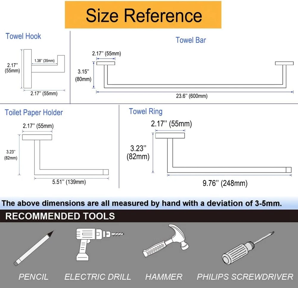 10-Pieces Bathroom Hardware Set Matte Black Accessories Product Details Color: Matte Black Material: Stainless Steel Product Dimensions: 23.6"L x 3.15"W x 2.17"H Finish Type: Powder Coated Brand: TAUN Installation Type: Screw-In Shape: Square Manufacturer: FENGZHUO Item Weight: 5.39 pounds Country of Origin: China Item model number: BN10 ▶【EASY TO INSTALL】: Using screw-mounting with stainless steel screws and anchors in package to make the towel bar set more stable. Screws are made from SUS 304 stainless steel and won't rust. ▶【RUSTPROOF】: The bathroom hardware set constructed of Type 304 premium grade stainless steel, with added 18/8 Chromium/Nickel content to protect against corrosion and rust, suitable for humid environments such as bathroom and kitchen. ▶【10 Piece Kit】: : A set of bathroom hardware includes 10 pieces useful accessories. 2 towel bars, 2 towel rings, 2 toilet paper holder and 4 robe hooks. Use square base, more durable,sturdy and fashion. Concealed screw towel hanger design makes the product look more beautiful and modern, hex screws are reinforced to prevent from rotation. ▶【NOTE】: We don't suggest using glue for install the towel bar, because it is easy to fall off, if you use screws to install, the bearing capacity can reach 20KG.