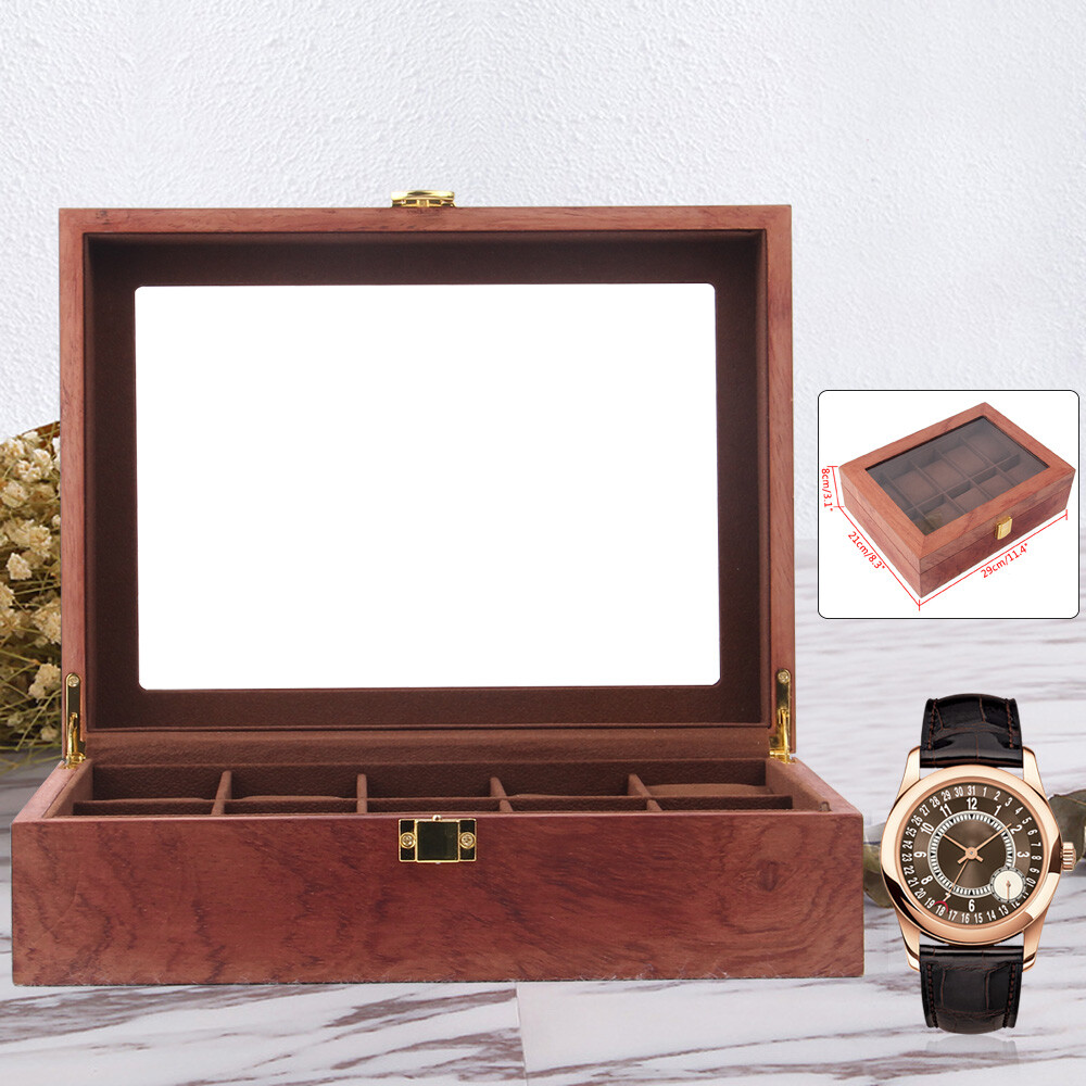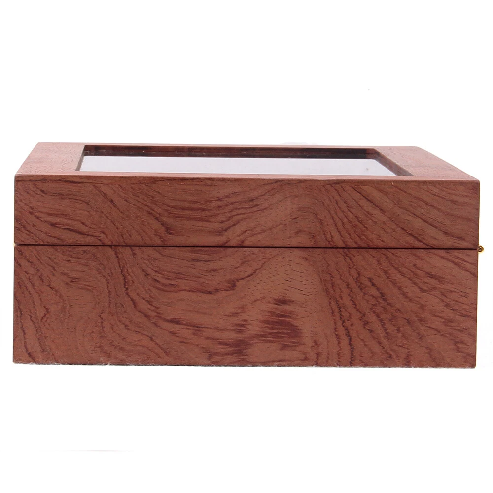 This wooden watch box is absolutely stunning! The rosewood grain gives it a classy, elegant look, while the velvet lining keeps my watches safe and scratch-free. The glass lid is crystal clear, making it easy to admire my collection without opening it. Perfect size for my dresser, and the 10 slots fit all my favorite timepieces. Great quality and very sturdy—definitely worth it! Love how it keeps everything organized and dust-free. Highly recommend!