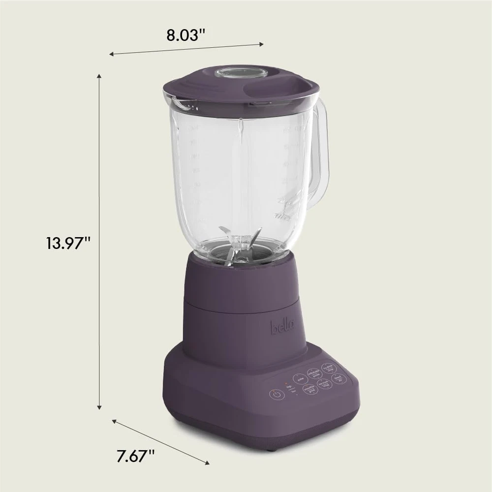 Space-Saving Design: Part of our Fits-anywhere kitchenware system, the bella Flip & Store Smoothie Blender features a unique design where the 6-cup jar flips onto the base, saving up to 50% more space when stored. Perfect for compact kitchens! Powerful Blending: Equipped with a robust 450-watt motor and a durable 4-tip stainless steel blade, this mixer effortlessly crushes ice, fresh or frozen fruits, and more. Create smoothies, soups, and salsas with a smooth, consistent blend every time 10-Speed Control: Customize your blending experience with 10 powerful speed settings, allowing you to blend, puree, liquify, or crush ingredients to perfection. Whether you’re making a protein shake or a frozen drink, the options are endless Easy-Pour Jar: The 6-cup, BPA-free jar is designed with a generous handle and an easy-pour spout, making it simple to serve your creations without spills. The removable measuring cap in the lid allows for precise ingredient additions while blending Effortless Cleanup & Storage: The jar and lid of the portable blender are dishwasher safe for quick cleanup, and the cord tucks away neatly to keep your countertop clutter-free. It’s designed for both convenience and style in your kitchen bella 10 Speed Countertop Blender, Juicer & Smoothie Maker, Fits-anywhere™ Kitchenware, Slim Flip & Store Design, Dishwasher Safe 48oz Capacity Pitcher & Lid, Stainless Steel Blade, 450 Watt, Plum