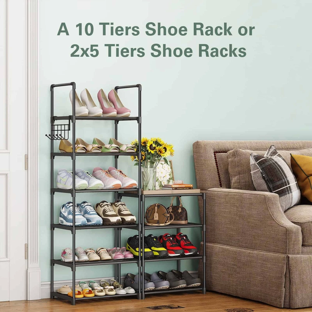 【Keep Your Shoes Neat and Tidy】: The BUG HULL 10-tier stackable shoe rack offers ample storage space for up to 24 pairs of shoes, making it the perfect solution for keeping your room organized and clutter-free. 【Built to Last】: Our shoe organizer is made with high-quality materials, including rust-proof metal tubes and a reinforced frame, ensuring that it remains stable and sturdy even when fully loaded with shoes. 【Fits Any Shoe Style】: Whether you're storing sneakers, boots, or high heels, our shoe rack can accommodate shoes of all sizes, up to US size 12. 【Maximizes Small Spaces】: The compact and narrow design of our shoe rack makes it the perfect solution for small spaces, such as closets, entryways, and apartments. 【Easy to Assemble】: With no tools required, our shoe rack is quick and easy to assemble, allowing you to start organizing your shoes in no time. Versatile Design: Our shoe rack can be used as a free-standing unit or split into two 5-tier racks, making it a versatile storage solution for any space. 【Hassle Free Customer Service】: We are committed to providing our customers with the highest level of service and support. If you encounter any issues with our product, our dedicated after-sales service team will promptly resolve them. Shoes Rack and Organizer 10 Tier Metal Shoes Rack Sturdy Construction Metal Tube Shoe Rack Perfect for 20-24 Pairs Shoes and Boots Convenient Hooks for Extra Storage Adjustable and Removable Shelves Easy To Assemble Easy Cleaning Perfect Size For Narrow Space Vertical Shoe Rack Organizer