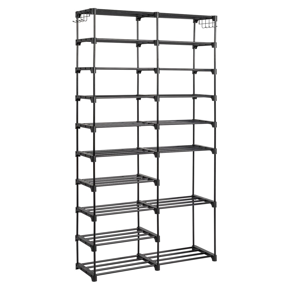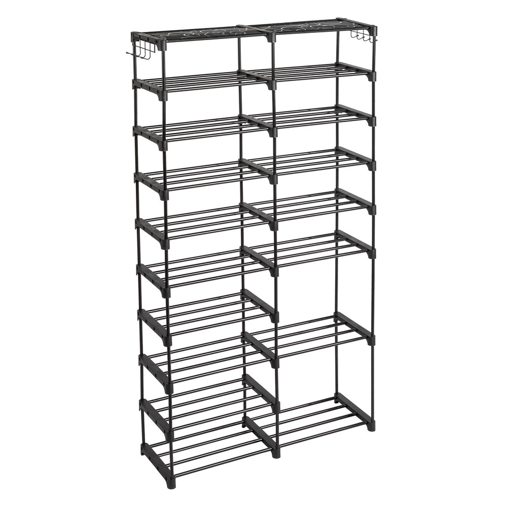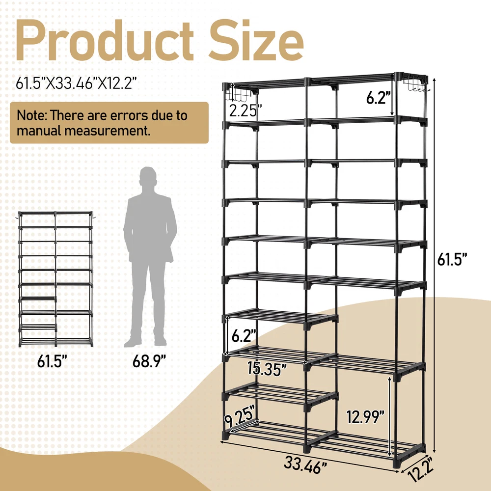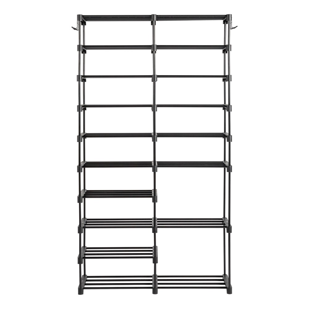 【Product Features】 • Storage and Placement: This shoe rack is designed with a double-row nine-layer structure, providing ample storage space for storing multiple pairs of shoes and boots, keeping the doorway tidy and orderly. • Design with handles: Each layer is equipped with handles, which is convenient for adjusting the position of shoes or taking out shoes, making it more convenient to use. • Non-woven material: Made of environmentally friendly non-woven material, it is soft and durable, effectively protecting shoes from scratches and easy to clean. • Black simple style: The overall black design has a simple and generous appearance and can be easily integrated into various home decoration styles. • Iron pipe frame: The main frame is made of sturdy iron pipes with a stable structure and strong load-bearing capacity, ensuring that it is not easily deformed during-term use. • PP pads: The bottom is equipped with PP pads to prevent scratches on the floor, while increasing stability and reducing noise during movement. [Specifications] • Dimensions: 85.7cm (width) * 29.8cm (depth) * 158cm (height) • Weight: 2.5kg 【Packing information】 • shoe rack