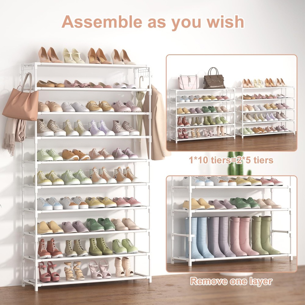 【Large Capacity 10 Tier Wide Shoe Rack】The 10 tier shoe organizer can up to 50 pairs of adult shoes, and you can remove one layer to fit long boots. This shoe organizer is not only suitable for shoes, but also for bags, toys, towels, sundries, books, plants and small accessories. Shoe storage with 10 hooks, you can hang keys, umbrellas, bags, etc., very practical design. 【Sturdy Material & Compact Structure】The tall shoe rack is made of durable waterproof non-woven fabric layers, reinforced plastic connectors and thickened iron pipes, good stability and prevents rust, The shoe rack for closet can hold larger and heavier shoes or objects. The shoe rack organizer has the characteristics of firmness, stability, and long life. 【High-quality Entrance Shoe Rack】Dimensions of shoe storage: 34"L x 10"W x61.2"H, simple and elegant appearance. The 50 pairs shoe racks can help you better save space and neatly a large number of shoes. It is very suitable for people who like to buy shoes, have many children, and have a big family. It is not only suitable for placing shoes, but also for placing books and sundries. 10 tiers tall shoe rack is perfect for closets, entryways, dorm rooms, apartments, hallways. 【Easy to Assemble】Use the included small wooden hammer to tap the joints to make the 10 tier shoe rack 50 pair tighter and stronger, which brings you great convenience, easy assembly by one person. Hold the shoes of all family members and keep them organized, you can also split into 5 tier shoe racks 2 units. 【Worry-Free Service】Any quality problems and problems with our 10 tier shoe rack for entryway after purchase, please feel free to our after-sales service.