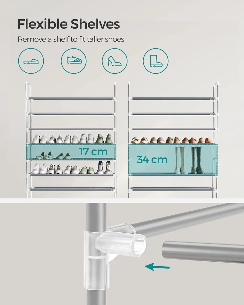 This shoe rack is a game-changer for small spaces! It holds up to 50 pairs without taking up much room, and the sturdy metal frame keeps everything neat. Assembly was a breeze with labeled parts and clear instructions. The non-woven fabric shelves are surprisingly strong, holding everything from flats to boots. Perfect for closets or hallways—highly recommend for anyone needing extra shoe storage!