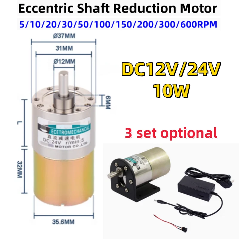 10W DC12V/24V 5-600rpm Reduction Gear Motor Deceleration Gearbox Eccentric Shaft