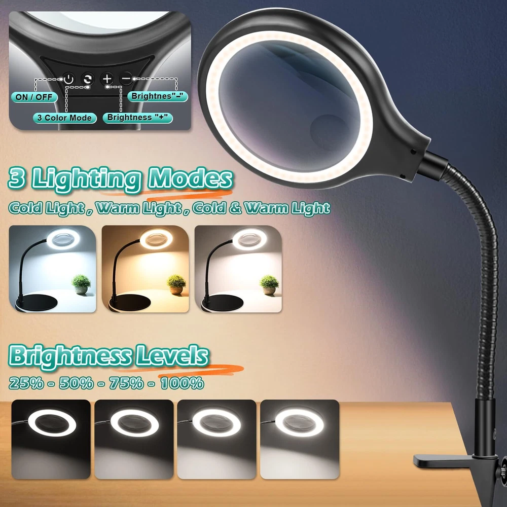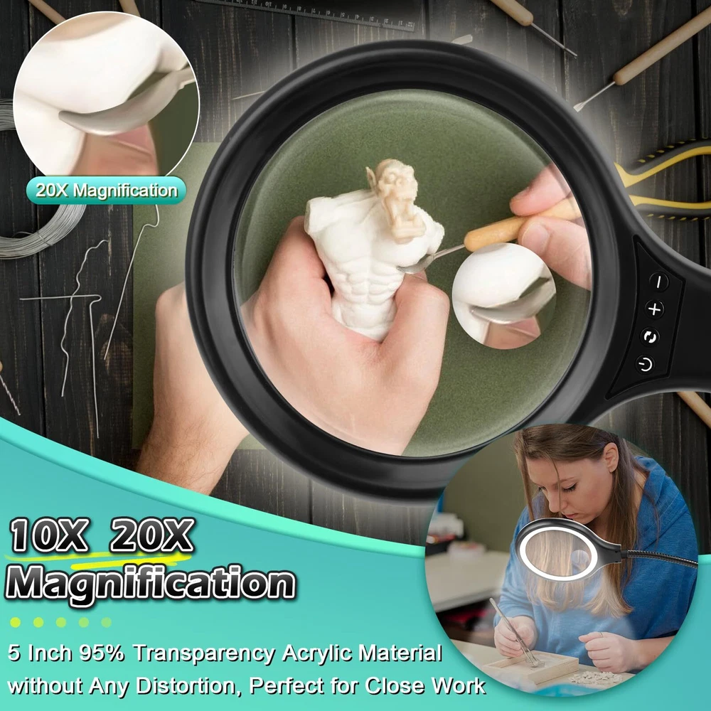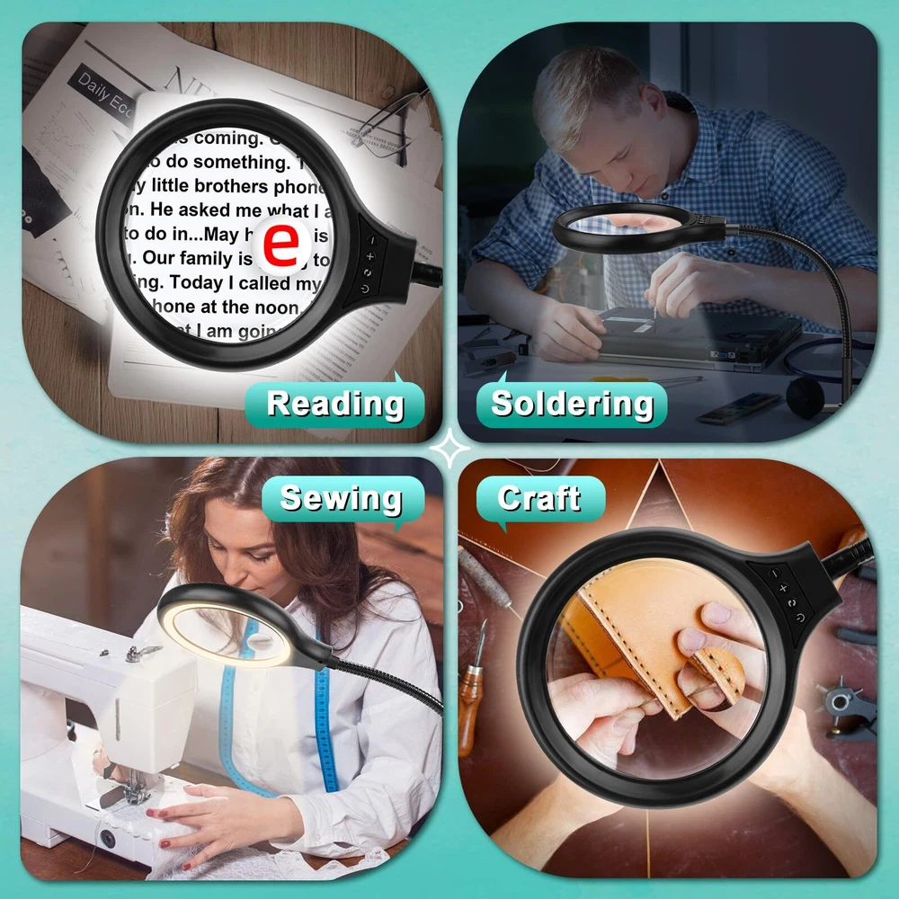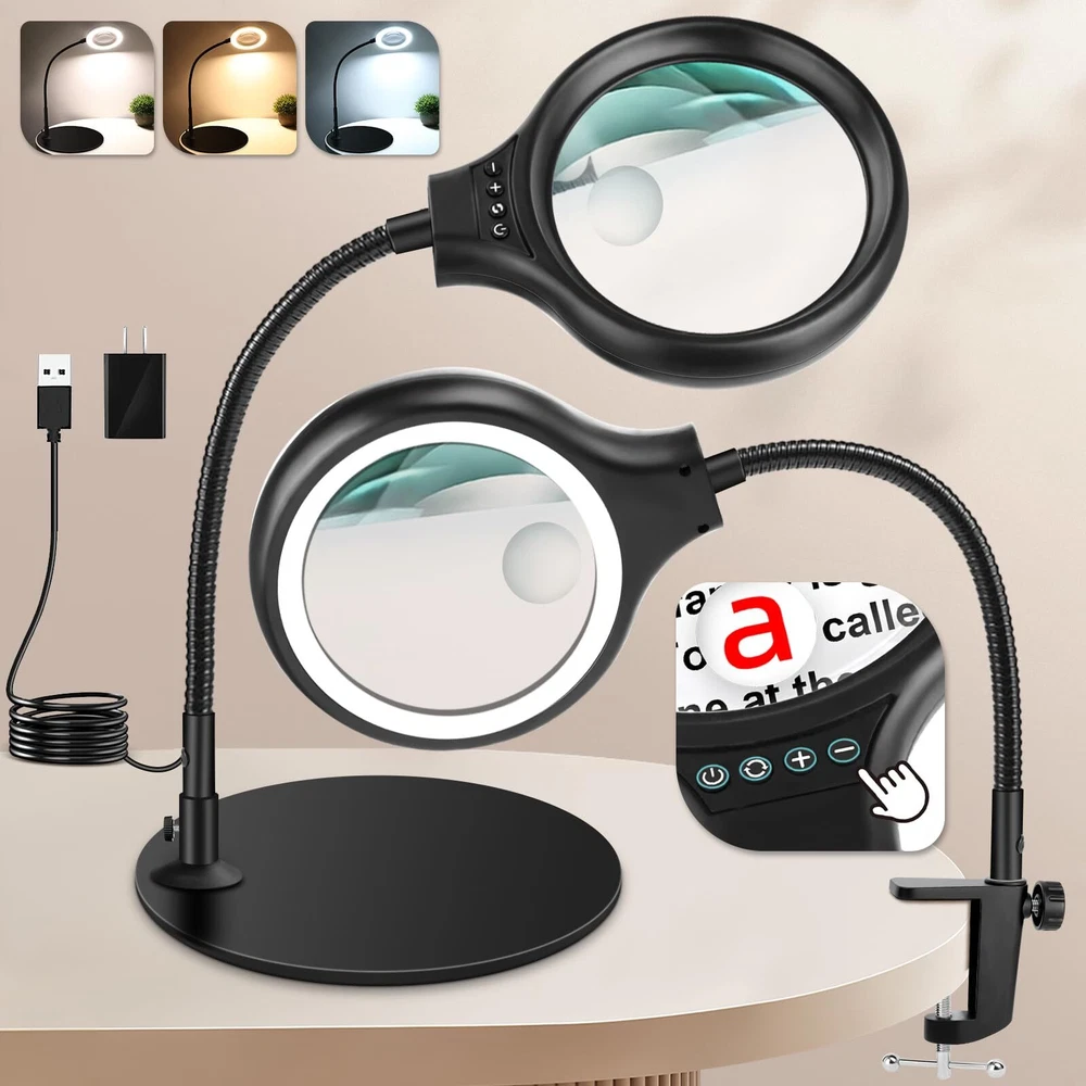 10X 20X Magnifying Glass & 95% Transparency: This clip on magnifying glass with light features 95% transparency acrylic material, which provides a clearness and distortion-free view. The large magnifying glasses with light for close work can magnify 1000%(10X), the small magnifying glass can magnify 2000%(20X). The reading magnifier for books will not cause dizziness, suitable for reading, sewing, cross stitch, soldering, beading, puzzle, repair, drawing, etc. Upgrate Head Buttons Switch: This lighted magnifying glass with stand mounts the switch on head, different with other switches on traditional power cords, so there's no need to bend down to find the switch, and it's easy to adjust the lighting settings just by reaching up. More convenient for using. Heavy-duty Base & Clip: The book magnifier for reading has a weighted base and a metal clip, max clamping distance of up to 2.4 in. The base is weighted, which stays well in place and doesn't tip at all. Can be easily installed without any tools. Just insert the lamp arm directly into the clip/base to fix the magnifier. The base/clip can extend the arms freely, and there is enough distance to use. A desk, workbench, shelf, or table all can be installed. 3 Color Mode and 4 Lighting Level: The magnifier for reading has 36 high-brightness LED lamp beads which power supply via a supplied USB cable and the adapter. The magnifying glass with light for reading features 3 colour temperatures(white, white&warm, warm) - each mode can be adjusted between 10% to 100% brightness. Choose the appropriate light according to the needs of the environment, in order to achieve the perfect lighting and reduce eye discomfort. Perfect Application on Small Details: This reading magnifying glass is very suitable for working on small/tiny things. And 10x magnifying glass with light also perfect for reading, sewing, painting, knitting, learning, painting, repairing, and soldering. This light with magnifying glass is a great gift for your friends, husband, or wife who need to focus on close work or crafts.