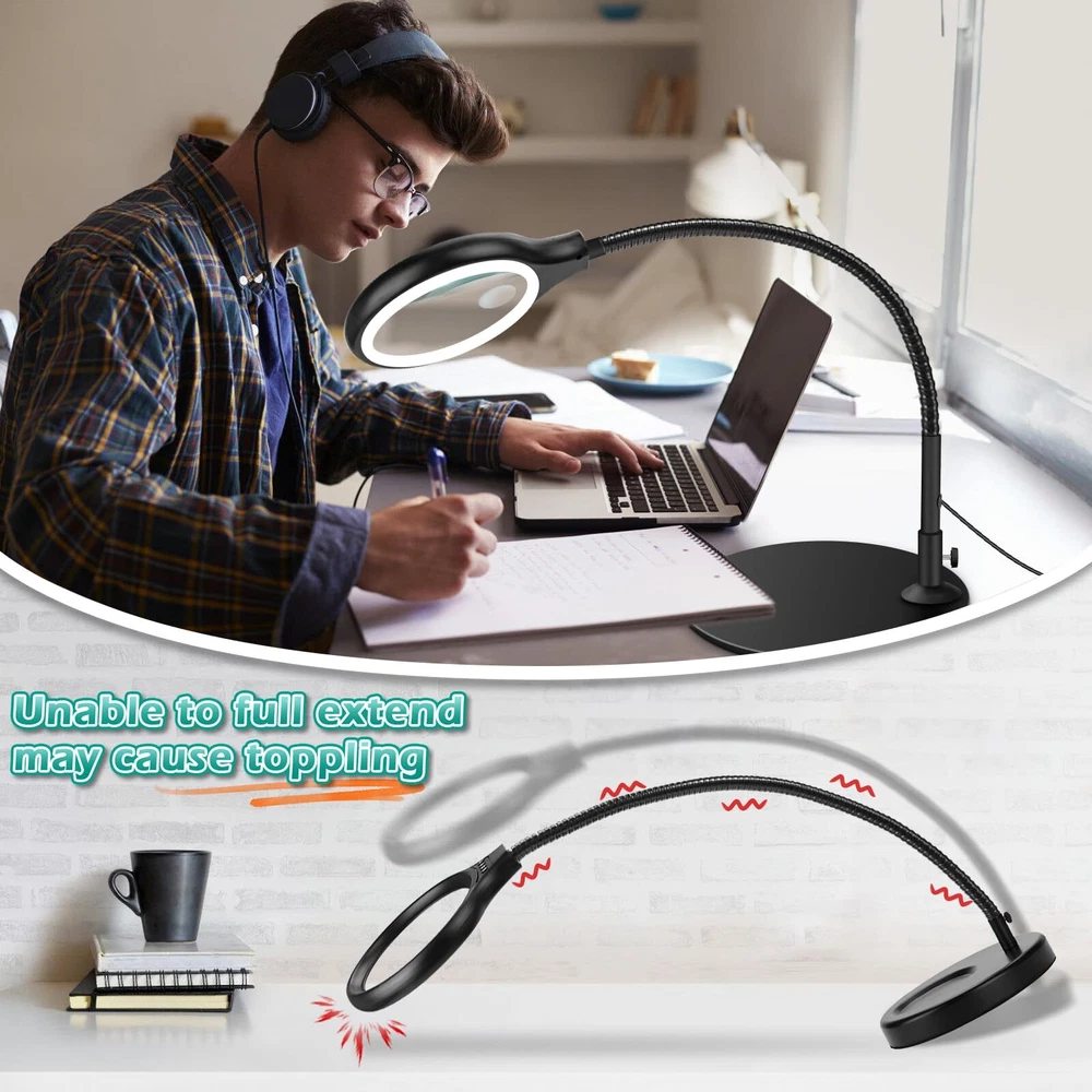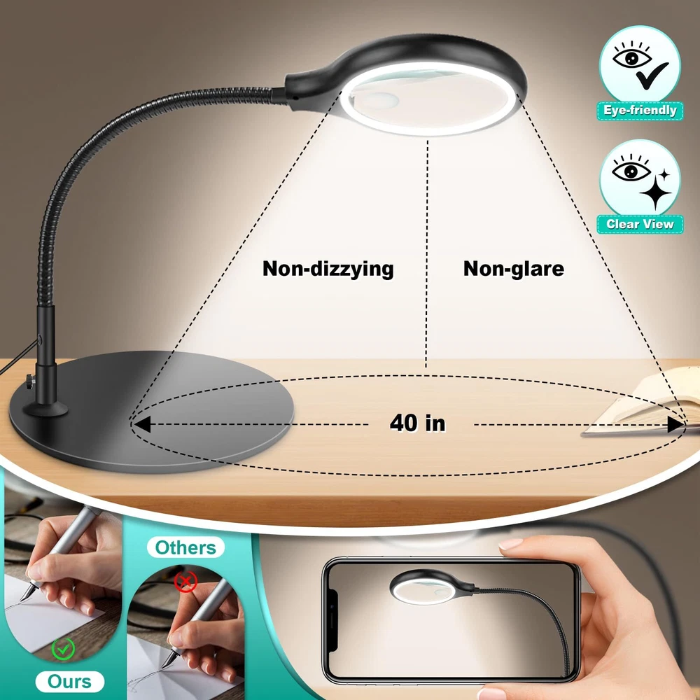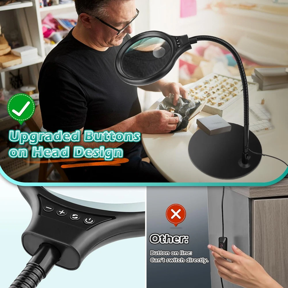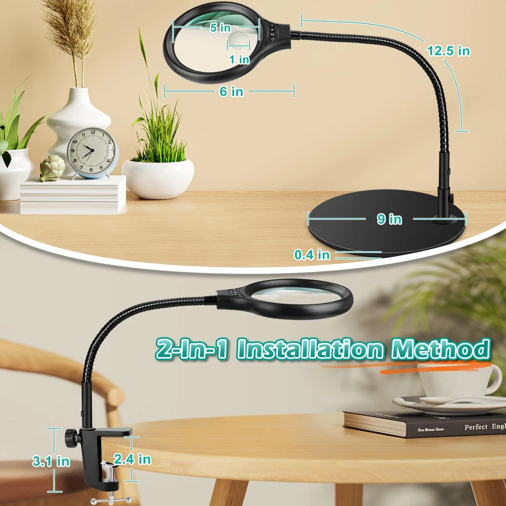 10X 20X Magnifying Glass & 95% Transparency: This clip on magnifying glass with light features 95% transparency acrylic material, which provides a clearness and distortion-free view. The large magnifying glasses with light for close work can magnify 1000%(10X), the small magnifying glass can magnify 2000%(20X). The reading magnifier for books will not cause dizziness, suitable for reading, sewing, cross stitch, soldering, beading, puzzle, repair, drawing, etc. Upgrate Head Buttons Switch: This lighted magnifying glass with stand mounts the switch on head, different with other switches on traditional power cords, so there's no need to bend down to find the switch, and it's easy to adjust the lighting settings just by reaching up. More convenient for using. Heavy-duty Base & Clip: The book magnifier for reading has a weighted base and a metal clip, max clamping distance of up to 2.4 in. The base is weighted, which stays well in place and doesn't tip at all. Can be easily installed without any tools. Just insert the lamp arm directly into the clip/base to fix the magnifier. The base/clip can extend the arms freely, and there is enough distance to use. A desk, workbench, shelf, or table all can be installed. 3 Color Mode and 4 Lighting Level: The magnifier for reading has 36 high-brightness LED lamp beads which power supply via a supplied USB cable and the adapter. The magnifying glass with light for reading features 3 colour temperatures(white, white&warm, warm) - each mode can be adjusted between 10% to 100% brightness. Choose the appropriate light according to the needs of the environment, in order to achieve the perfect lighting and reduce eye discomfort. Perfect Application on Small Details: This reading magnifying glass is very suitable for working on small/tiny things. And 10x magnifying glass with light also perfect for reading, sewing, painting, knitting, learning, painting, repairing, and soldering. This light with magnifying glass is a great gift for your friends, husband, or wife who need to focus on close work or crafts.