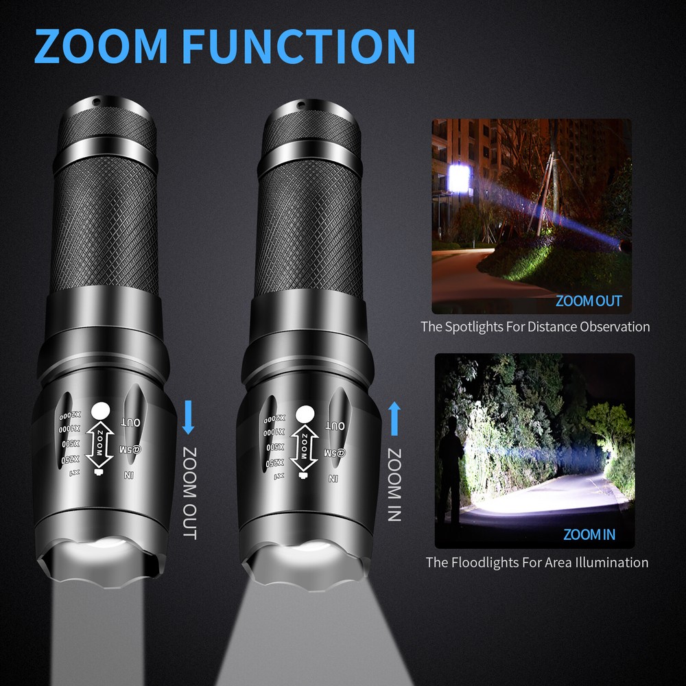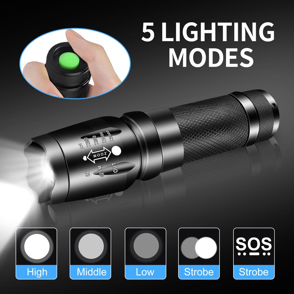 Voltage: 3.7V Color: Black Material: Aluminum Battery Included: No Power Source: Rechargeable Battery or AAA(Not Included) Battery Technology: Rechargeable Battery or AAA(Not Included) Lighting Technology: Super Bright LED Brand: Sky Wolf Eye Custom Bundle: No Model: Super Bright LED Flashlight Small Operating Time: 5-10 Hours Features: Waterproof, Handheld, Adjustable Focus, Rechargeable Batteries are not included, Super Bright Zoomable LED Flashlight, Flashlight High Lumens Super Bright Waterproof, LED Mini Flashlight Super Bright, Mini LED Flashlight Portable Work Light Type: LED Flashlight Tactical