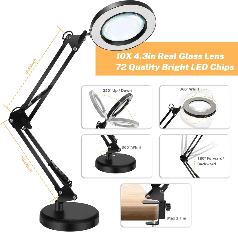 10X Magnifying Glass with Light and Stand, 2 in 1 black stand clamp