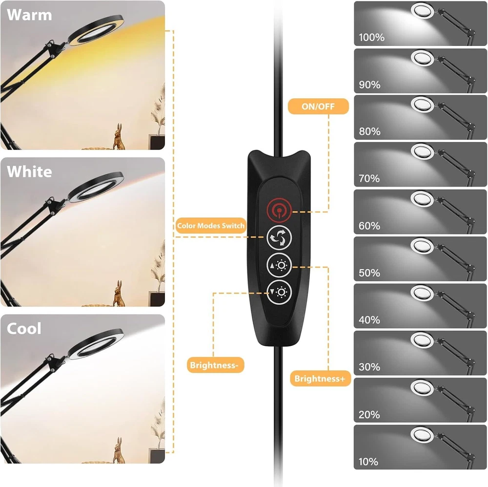 10X Magnifying Glass with Light and Stand, 2 in 1 black stand clamp Product Details Finish Type: Matte Base Material: Iron Bulb Base: Wedge Product Dimensions: 11.02"D x 3.23"W x 11.02"H Item Weight: 3.9 Pounds Lamp Type: Desk Lamp Shade Color: black Style: Modern Brand: YECERCAN Color: black with stand and clamp Special Feature: Dimmable, Adjustable Arm Light Source Type: LED Material: Glass, Iron Room Type: Bed, Table, Desk, Workbench Number of Light Sources: 1 Included Components: Clamp, 10X Magnifying glass, Base Number of Items: 1 Lighting Method: LED Indoor/Outdoor Usage: Indoor Is Cordless?: No Manufacturer: YECERCAN Part Number: 10Xblack01 Item Weight: 3.9 pounds Country of Origin: China Item model number: 10X Finish types: Matte Special Features: Dimmable, Adjustable Arm Batteries Included?: No Batteries Required?: No Product Dimensions : 11.02 x 3.23 x 11.02 inches; 3.9 Pounds Item model number : 10X Manufacturer : YECERCAN Country of Origin : China Finish Type: Matte Base Material: Iron Bulb Base: Wedge Product Dimensions: 11.02"D x 3.23"W x 11.02"H Item Weight: 3.9 Pounds 2-in-1 Standing Magnifying Glass with Light: We provide 2 kinds of base for your convenience:1,Heavy duty weighted base, so you can use it as desk lamp; 2,Metal clamp, so you can clip the magnifying light to a workbench,shelf, desktop,or anywhere is flat within 2.1”thickness to free your hands. 10X HD Magnification: The lighted magnifying glass lens is made of real glass, provides you a clear view without optical distortion. 10x magnification makes the detail works more easier, like soldering, cross stitch, electronics repairs, hobby observation, book reading for elderly. 3 Color Modes & 10 Brightness Levels: Equipped with 72pcs bright LED lamp head, the Led magnifying lamp provides uniformly illuminate, no flicker, no glare to protect your eyes. And there are 3 color modes(White, Warm, Cool) and 10 brightness levels(10%-100%)for your to choose based on your needs. 360°Flexible Adjustment: Our magnifier with light and stand has 2 metal swivel arms, the long arms which can be extended to 20”,they can be adjusted to any angle view you need, and the light head can be turned 360°to meet your needs. 100% Satisfaction: YECERCAN lighted magnifying glass with stand is a perfect gift on father's day for elderly,people with low vision or those who needs to do the close works/ hobbies constantly, tool free to assembly and easy to use, brings light to your life.