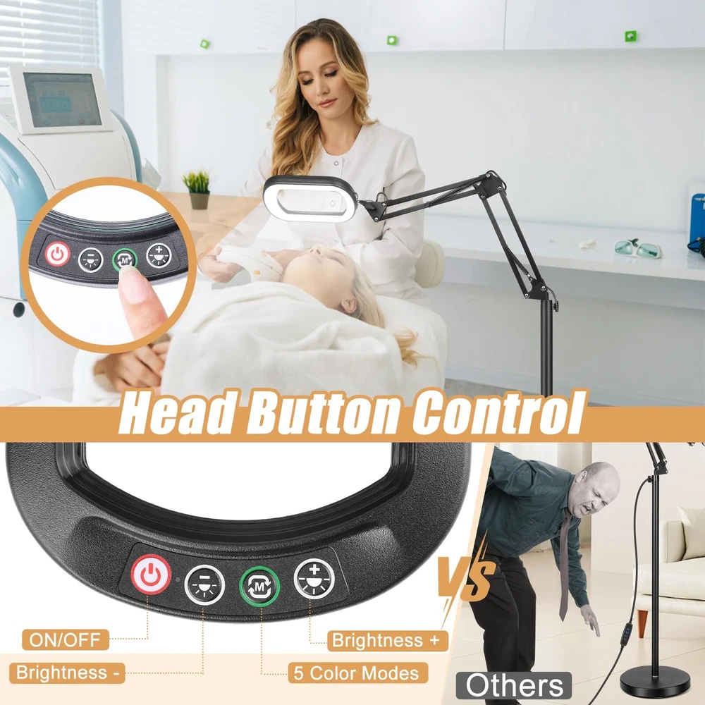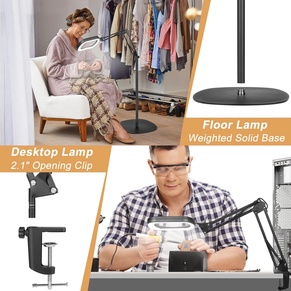 3-in-1 Magnifying Floor Lamp & Clip-On Desk Lamp: This magnifying lamp features a heavy-duty metal base, a metal clamp, detachable rods, and a swing arm magnifier. You can adjust the height by combining the rods or convert it into a clip-on desk lamp by attaching it to tables or desktops, freeing up your hands and ensuring comfortable use in any workspace. Whether you're working on intricate tasks or just need hands-free lighting, this floor magnifying lamp adapts to your needs. 5-Inch 10X Rectangular Real Glass Lens: The large rectangular lens provides a wider viewing area, perfect for reading or detailed tasks. The high-definition, distortion-free glass lens eliminates dizziness and eye strain, giving you clear 10x magnification that’s gentle on your eyes even after extended use. This feature is especially beneficial for seniors, hobbyists, and professionals who require a clear and unobstructed view of their work, making every task more comfortable and efficient. 5 Color Modes & 10 Brightness Levels: Customise your lighting with 5 different color temperatures and 10 brightness options. The memory function remembers your last setting, so it’s ready just the way you like it every time. This versatility makes it perfect for crafts, esthetician, aesthetic, , hobby, puzzles, needlework, embroidery, and other close work. Whether you need a bright white light for focus-intensive tasks or a softer, warmer light for relaxed reading, this floor lamp covers all bases. Head Button Design for Easy Light Adjustment: The button is conveniently located on the lamp head, so you can adjust the light settings without searching for a switch, making it effortless to use. This user-friendly feature is especially useful for reading books, sewing, painting, cross stitching, crafting, knitting, drafting, etc. Flexible and Stable Adjustable Arm: The magnifying floor lamp’s adjustable arm allows for easy positioning at various angles, and it stays firmly in place once adjusted. Whether you’re working on detailed tasks or need to direct light at a specific area, this magnifying light provides a stable, hands-free experience. The durable and adjustable design ensures that the lamp stays in the desired position without drooping, giving you the confidence that your workspace will always be well-lit and your hands free to focus on what matters.