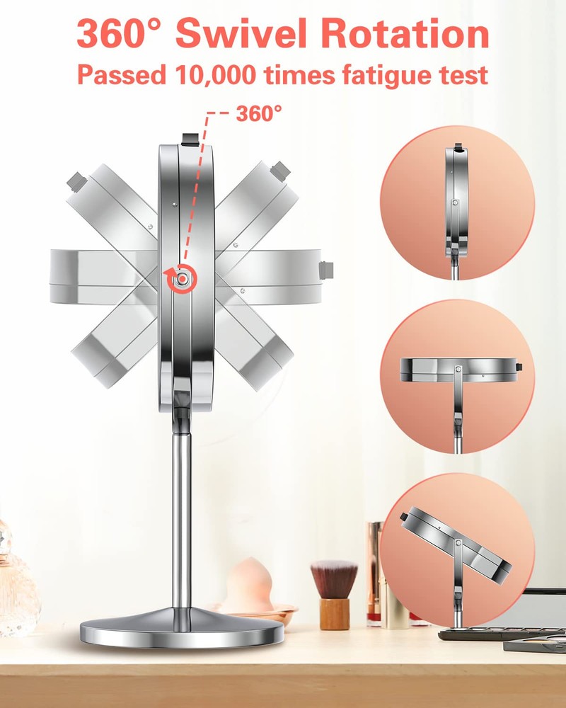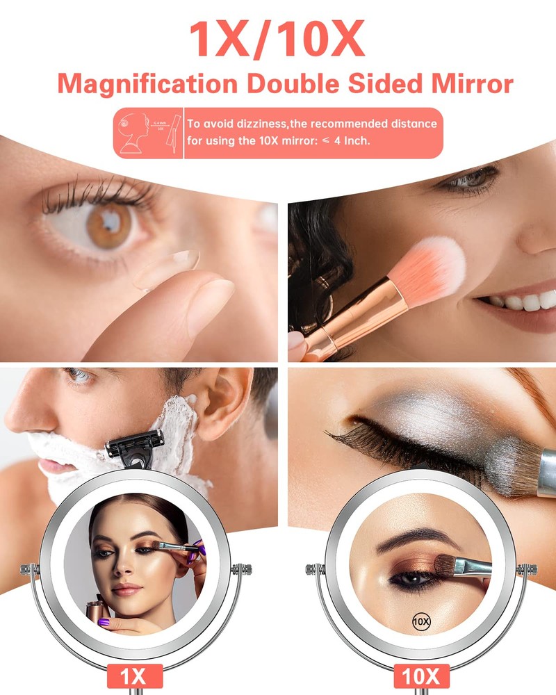 【1X/10X Magnification】This magnifying mirror is double-sided with 1x/10x magnification, which is the best beauty tool for women who care about their look. The magnifying side can focus on your detailed facial features even your tiniest pore, help you to achieve flawless makeup: plucking eyebrow or applying mascara, beard shave, acne blackhead removal and etc 【LED LIGHTED MAKEUP MIRROR】Our lighted vanity mirror is built-in 18 pieces, this mirror with lights could bring you sufficient lighting under any dark condition. It also provides natural and soft light that is perfect for putting on makeup 【360° FREE ROTATION】360 degree free rotation can help you adjust to the best angle for viewing. Applicable to bedroom, bathroom, hotel and etc 【ELEGANT & COMPACT DESIGN】Our make up mirrors lighted magnifying has an anti-slip base and sturdy frame, it only takes a little place to place on. With compact design, this makeup mirror is light-weighted and easy for you to carry or remove. And it definitely a good companion for travel with you 【BEAUTIFUL GIFT & 100% SATISFACTION GUARANTEE】This elegantly designed mirror will be a perfect gift for Christmas, Thanksgiving, Birthdays, Anniversaries, Mother's Day and Valentine's Day. Our support team is always available to assist you with any issues you may have with your cosmetic mirror. Please feel free to reach out to us at any time for assistance