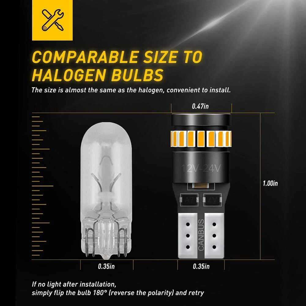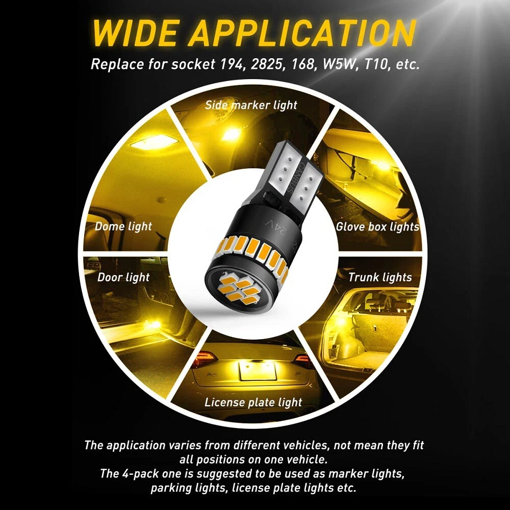 Feature: 1. 3014 LED chips: 24SMD for 360 degree full lighting distribution. 2. Universal T10/194 connector: improved plug, sit tightly into the original sockets. 3. Built in intelligent IC driver: ensures constant current & Canbus error free for 95%+ vehicles. 4. High bright 3014 LED chipsets: 6000K white, no dark spots, super bright, low consumption. 5. Fast heat dissipation: built-in intelligent IC adjust the temperature according to the environment automatically. 6. Wide application: replace for cocket 194, 2825, 168, W5W, T10, etc. 7. Used as side marker light, glove box light, trunk light, license plate light, door light, dome light, etc. Specification: Brand: AUXITO 10X T10 Led Car Side Light YELLOW Bulbs Error Free Canbus Xenon W5W Sidelight Feature: 1. 3014 LED chips: 24SMD for 360 degree full lighting distribution. 2. Universal T10/194 connector: improved plug, sit tightly into the original sockets. 3. Built in intelligent IC driver: ensures constant current & Canbus error free for 95%+ vehicles. 4. High bright 3014 LED chipsets: 6000K white, no dark spots, super bright, low consumption. 5. Fast heat dissipation: built-in intelligent IC adjust the temperature according to the environment automatically. 6. Wide application: replace for cocket 194, 2825, 168, W5W, T10, etc. 7. Used as side marker light, glove box light, trunk light, license plate light, door light, dome light, etc. Specification: Brand: AUXITO Plug: T10 194 168 W5W Plug&play: YES Voltage: DC12-24V CANBUS: YES Color: AMBER YELLOW Size: almost same as the halogen Waterproof: IP67 Warranty: 2 year Lifetime: >30000 hrs Applications: 4PC(marked with 12-24V): fit all applicable positions, recommend for license plate light, parking light, marker light. 6PC: fit for map light, dome light, glove light, door light, trunk light, etc, not for license plate light, parking light, maker light. Note: The application varies from different vehicles, not mean they fit all positions on one vehicle. Package 4x 24V AUXITO T10 LED Light Bulbs 6x 12V AUXITO T10 LED Light Bulbs Item Specifics Features CANbus Compatible Bulb Fitment Code W5W (168) Manufacturer Warranty 2 Years More LED Car Light We have T15 921 1156 1157 3157 3156 7443 7440 P21W PY21W Light Colour Yellow MPN AUXITO24HT10 More Car Light We Have 7 Indicator Light/Glove Box Light/Footwell Light More Car Light We Have 2 Work Light/Wheel Light/Warning Strobe Light More Car Light We Have 6 Instrument Panel Light/High Beam/Headlight Colour Temperature 6500K OE/OEM Part Number AUXITOLED Voltage 12V More Car Light We Have 8 Fog Light/Emergency Light/Daytime Running Light Performance Part YES Lighting Technology LED Reference OE/OEM Number AUXITO HIGH QUALITY LED Suitable For Accessory Light Boot Light Combination Light Dome Light Emergency Light Footwell Light Glove Box Light Indicator Light Instrument Panel Light Map Light Number Plate Light Underbody Light Wheel Light Work Light Rear Light Beam Angle 360° More Headlight LED Kit We Have H1 H3 H7 H11 H9 H8 9005 HB3 9006 HB4 9014 H4 More Car Light We Have 9 Combination Light/Centre Brake Light/Brake Light Universal Fitment YES Model T10 Car Light HIGH Quality More Headlight LED Kit We Have 2 9003 HB2 9004 HB1 9007 HB5 9008 H13 More Car Light We Have 5 Off-Road Light/Map Light/Low Beam/Light Bar Interchange Part Number AUXITO24HT10 More Car Light We Have 1 Dome Light/Parking Light/Number Plate Light More Foglight LED Kit We Have H1 H3 H7 H10 H11 H8 H9 H16 9005 HB3 9006 HB4 881 Light Color Warm White Number of Bulbs 10 Wattage 10 W More Car Light We Have 4 Side Indicator Light/Reverse Light/Rear Light Classic Car Part YES More Car Light We Have 3 Underbody Light/Third Brake Light/Side Marker Light Manufacturer Part Number AUXITO UK STOCK More Car Light We Have 10 Boot Light/Accessory Light Brand AUXITO More LED Car Light We have 2 T10 W5W 194 168 175 C5W 31mm 36MM 39MM 41/42MM Bulb Life Hours Up to 30,000 Hours Type Light Bulb Color Temperature 6500K FAQ ♥ If you have a decoding problem or any other problems, please contact us first, we will help you with it. We will reply you within 24 hours in working days. I'm a new seller, thanks a lot for your trust and convince! I will serve you with all my heart. ♥ Q1: Will this bulb fit my vehicle? A: We can match almost any vehicle to one of our bulb sizes. eBay only lets us include some vehicle fitments per listing, but if your vehicle does not show up on the compatibility table at the top of our listings, welcome you to contact us for free consulation before purchasing a product. Q2: My item has not arrived, what's taking so long? A: Sometimes items take longer than expected, especially if it’s going far or to rural area. Check with your post office to see if your item has been held up. Sometimes Royal Mail will not update a tracking number until it has arrived at its destination. If your item still don't arrive after a few days, let us know so we can double check for you and help solve it asap. Q3: My bulbs won't fit, help! A: Special bulb holder may be required. See if you can take the holder from the stock bulb. If not, let us know. The bulb size may be wrong, double check the item you received with the item you ordered. Do you have an aftermarket lighting housing? These may not be perfectly fitted for aftermarket bulbs and will require some manual modifications. Q4: Neither side lighting up? Both sides flicker, hyper flash, or work inconsistantly. A:Check the light fuses, and then check the ballast plugs to insure correct installation. If this doesn't work, there may be a voltage problem with the vehicle. You probably just need a relay or capacitor. Even though some bulbs are builtin resistors, they may still need a decoder. Pay & Ship (1). We gladly accepts payment via PayPal, We will ship your item(s) within 24 hours. (2). Before payment, please keep the consistency of Paypal address and ebay address. (3). Quantity orders are welcome! Returns (1). We offer 60 days free return 