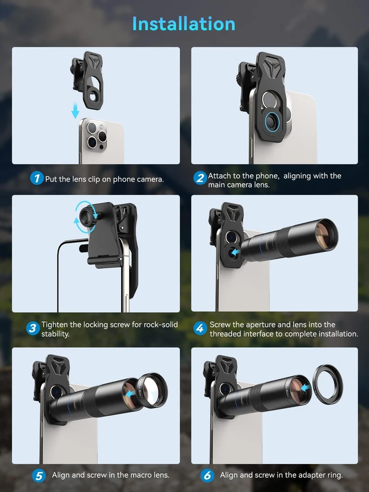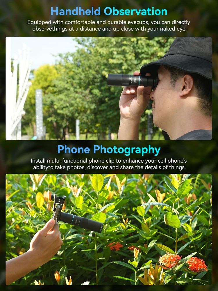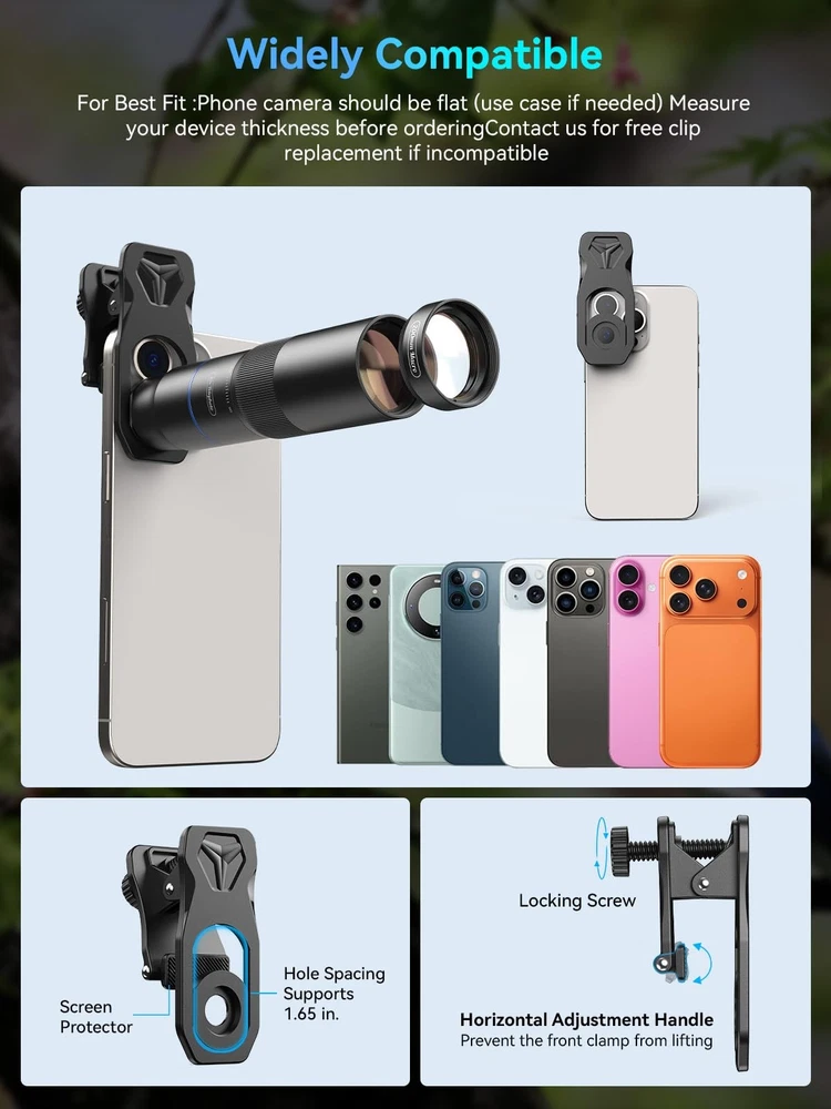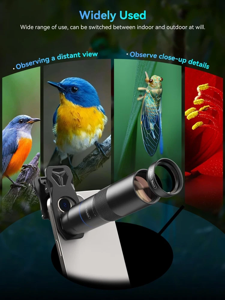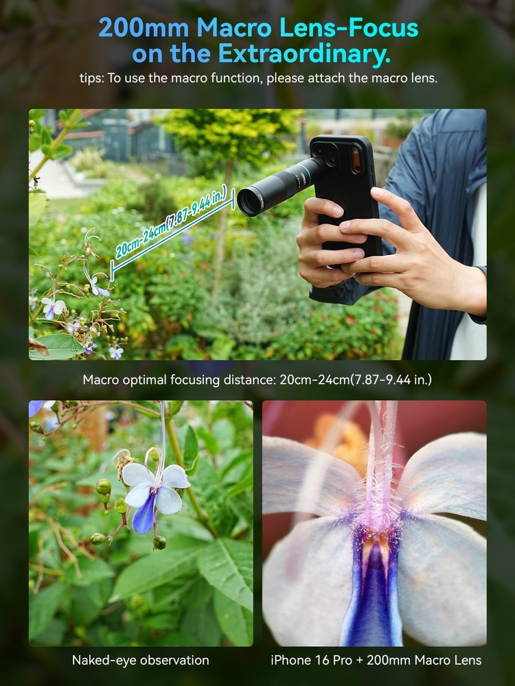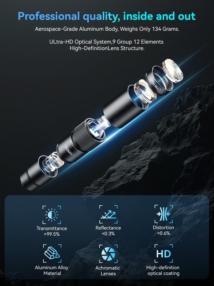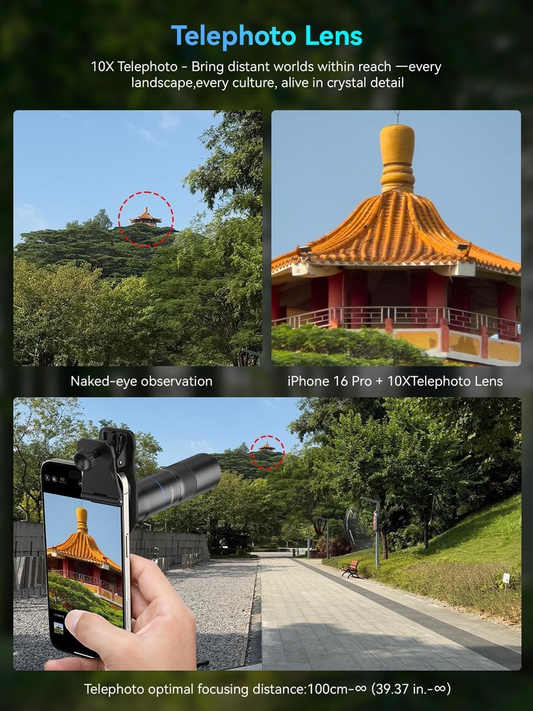 10X Telephoto Lens & 200mm Macro Lens Ultra-HD Optical Technology: 10X telephoto & 200mm macro Lens kit use the 9-element, 12-glass design with Nitto A-grade imported optics. Both lenses feature double-sided AR+AF multi-layer coatings (FMC) to reduce reflection and enhance clarity. After precise color correction, they deliver light transmittance ≥ 99.5%, distortion ≤ 0.5%, and reflectivity ≤ 0.3%. Enjoy crystal-clear images with accurate colors 2-in-1 Lens Kit(Telephoto & Macro): Our phone lens attachment combines 10X telephoto lens and 200mm macro lens. Not only can it capture sharp and clear distant shots, but it also allows for detailed close-up photography when the macro lens is attached. Break free from single-purpose lenses—enjoy the power of two in one. (Optimal shooting range: Telephoto 1000mm–∞ / Macro 200–240mm) Seamless 2-in-1 Design: Functioning as both a telephoto and macro lens, this accessory offers dual modes for your iPhone. Use it with the universal clip for powerful smartphone photography, or attach the eyecup to convert it into a portable mini monocular for direct viewing Aluminum Body, Refined & Elegant: Our smartphone camera kit is crafted from aerospace-grade aluminum with a sleek, matte-black anodized finish for a premium feel. The thoughtful design includes a focus ring and a 30mm to 37mm expansion interface. Its seamless unibody construction has no protruding parts, resulting in an elegant form that weighs just 145 grams Perfect Gift for Photography Lovers: The TM10 TeleMacro Lens features a large 37mm eyepiece and an optimized eye relief design that helps minimize vignetting on your phone, delivering a wider, clearer field of view. When paired with your phone's native zoom, it elevates the visual performance to the next level, making it an excellent gift for any mobile photography enthusiast. Wide Compatibility: The 10X telephoto lens with macro capabilities offers seamless compatibility with most popular smartphones, including iPhone, Samsung, Google Pixel, Huawei. For optimal performance with multi-camera phones, please attach the lens to the main camera and disable the auto-macro mode before use.