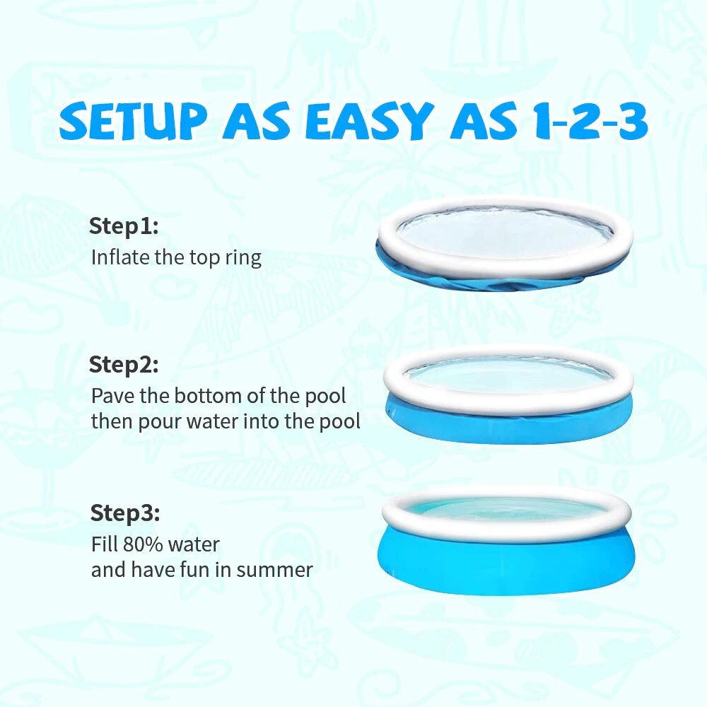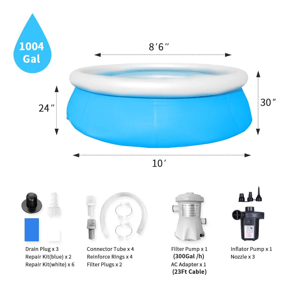 💦Practical & Portable: Our pools for the backyard are easy to assemble, practical, and space-saving, The outlet is designed for easy drainage, you can build a pool in your yard/garden anytime you want to play, clean and sanitation, When you don't need to use it, just drain the pool through the drain and then fold it up for storage, easy to use, so just enjoy your summer days, create an unforgettable and cool memory with your families and friends! 💦Environmental Protection Materials: Our swimming pool adopts a three-layer composite mesh design, made of high-quality environmental protection PVC interlayer, Non-toxic material, anti-aging, anti-ultraviolet and anti-corrosion, safety and durable, harmless, and environmentally friendly. 💦Family-sized pool: 10ft x 30in a swimming pool can hold 5~6 kids, Perfect for staying at home with your family and kids playing in the water to get rid of the summer heat. 💦Easy to Set: Our above-ground pools are easy to set up, just flatten the bottom and then fill the inner circle of the pool with an inflator, easy to operate, super convenient. 💦Note: Do not place the swimming pool in the sand, mud, or any soft or loose soil conditions. Number of people: 5 to 6. Product description: Fast US Shipping! Such a convenient inflatable pool you have worth to have it. Want to enjoy a fun-filled summer at home specially for families with younger children! Fits Anywhere In Your Home: Ideal for deck, backyard, garden or back porch. Name: Round inflatable swimming pool. Color: Blue. Capacity: (90%)3638 L,fits up to 5 to 6 people. Package contains: 10ft * 30in Inflation pool x 1 Air Pump x 1 Filter Pump x 1 Repair Kit x 1 How to use it: 1.Clear the horizontal space in the yard, if possible, put a large cloth/tarpaulin under this pool; 2.Inflate the top of the pool; 3. Pour 2 cm of water to smooth the bottom of the kids pool without wrinkles; 4. Pour water into the pool, smooth out the wrinkles around the pool and finish.