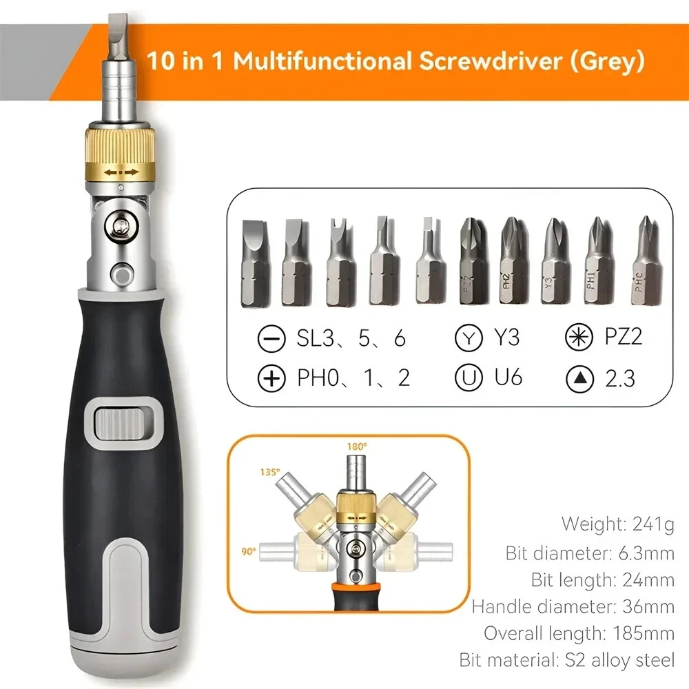 Report Item • 10 in 1 Portable Ratchet Screwdriver :This screwdriver set includes 10 different heads, making it a versatile tool for various tasks. • Hidden Screwdriver Head :The screwdriver head is designed to be hidden, allowing for easy storage and transportation. • Multi Angle Corner Capable :The screwdriver can be adjusted to different angles, making it easier to reach tight spaces and corners. • Triangle Screw Head Type :The triangle screw head type ensures a secure hold on the screw, preventing it from slipping or falling out. Product Information Features: Multi angle replacement/internal storage of 10in1/chrome vanadium steel material Specification: Product name: Ratchet screwdriver set Materiale Product: Chrome vanadium vanadium Product Type: Ratchet screwdriver Size:185 × 30 × 30 mm Color:show as pictures Usage scenario: Construction sites, home furnishings, doors and windows, automotive repairs, electrical appliances Package included: Package1 : 1x Orange screwdriver handle/10x heads Package2 : 1x Grey screwdriver handle/10x heads Notice: 1.The product dimensions are all manually measured, and there may be slight errors. Please refer to the actual product received for accuracy. 2. Due to the difference between different monitors, the picture may not reflect the actual color of the item. We guarantee the style Is the same as shown In the picture.