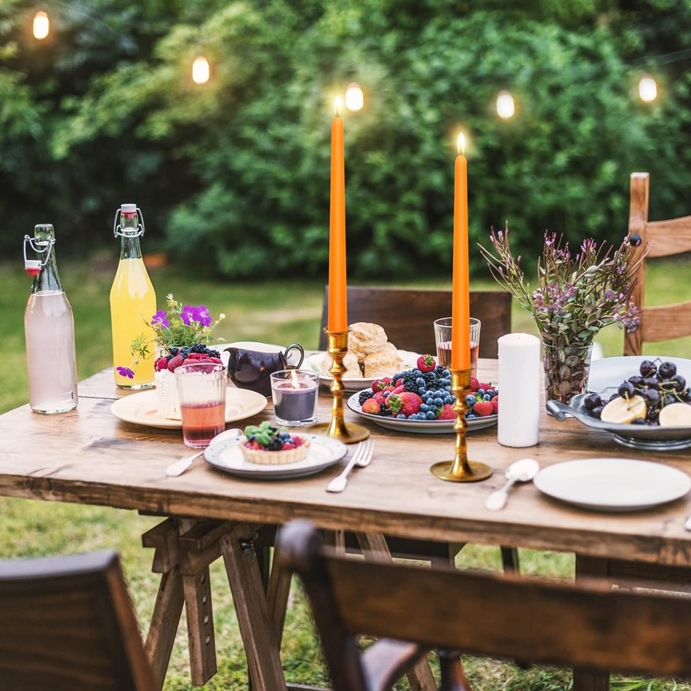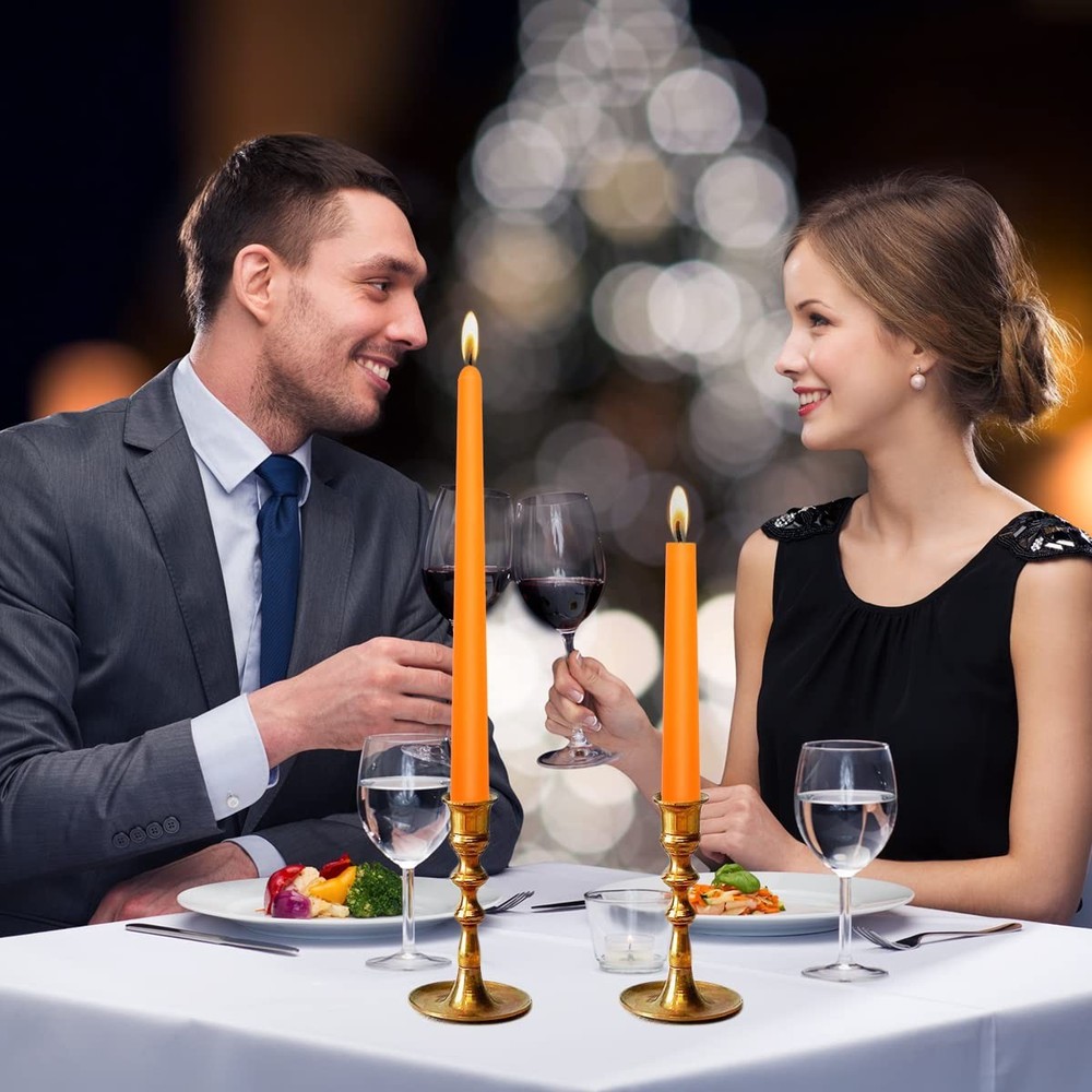 Enjoy our elegant, fragrance free taper candles. Classic candlesticks are perfect for entertaining. Either you have a formal event, big wedding coming up or just romantic dinner for two, those tall candles will make an excellent atmosphere. Package includes: 12 x Orange taper candles Taper candles are so fun to switch out. Deep red candles may be more romantic. A classic white taper can underscore a sensation of elegance. Use red ones for Christmas, black or orange for Halloween, pink for birthdays, purple and pink for Advent. If you’ve been lighting your living room with cozy red candles all winter long, perhaps a bright green or blue can celebrate the arrival of spring. We have taper candles in many colors for sale, such as white, ivory, black, pink, purple, blue, dark red, green. In the future, more colors of taper candles will be developed for everyone to choose, such as orange, gold, silver and so on. And you can also let us know which color you like. Long Evenly Burn: The orange taper candles fit a 7/8" base and measure 10 inches tall. They burn slowly and last for a long time of 8 hours to give off a great tall flame that lets off good strong light. Dripless and Unscented: The orange candlesticks are narrow at the top and progressively get thicker at the bottom, and can sit nicely straight in candle holders. The wax is designed to drip inward, so no mess on tablecloth from dripping wax. Versatile for Parties or Emergencies: The taper candles burn pretty slow and not scented but creates a great ambiance, so whether a big dinner party/special meals for decor or a power outage for emergency lighting, it's exactly what you need and becomes your go to candles. Calm Down Your Mood: Do you want to relax yourselves at home after hard day work? Just lit one white taper candle on the table, sit into the quiet outdoor sky, and blank your mind to create relaxing atmosphere. All worries or anxiety goes away at that moment. Quality : If there is any problem in the white dripless taper candlesticks, please for returning or . Thank you for purchasing our white taper candles.