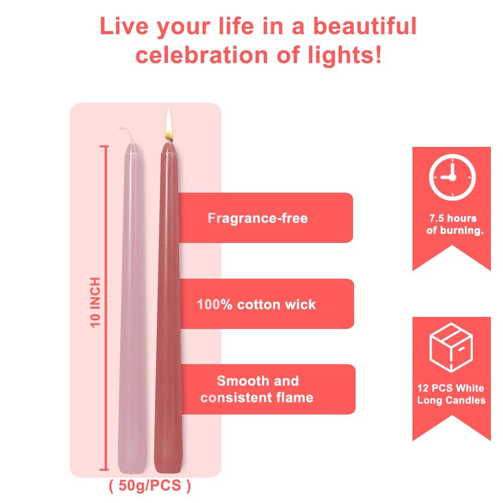 1. These pink taper candles are absolutely stunning! The color is vibrant, and they burn beautifully for hours without smoke or scent. Perfect for adding a romantic touch to dinners, weddings, or any special occasion. The set of four is a great value, and the long burn time makes them ideal for extended use. Love how they create a cozy, elegant atmosphere!