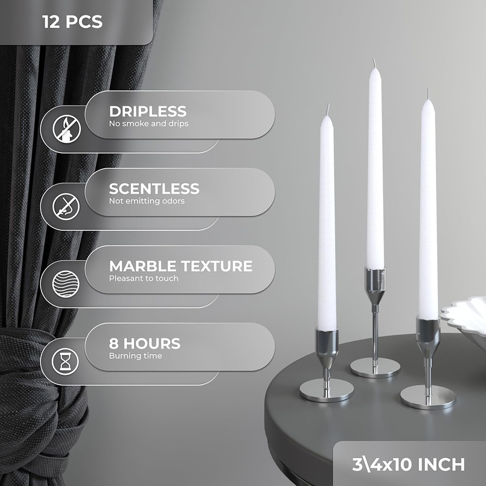 Welcome to the world of , where vibrant and meticulously crafted long lasting candles await your discovery. These thoughtfully Shabbat candlesticks long promote tranquility through their gentle, tension-easing glow. Our Shabbos candles white boast several remarkable features. They are fragrance-free, smokeless, and crafted from non-toxic paraffin wax, ensuring a safe and enjoyable experience. Additionally, they are equipped with lead-free 100% cotton wicks. A friendly tip - Using a stick candle holder can significantly extend the life of your taper candle stick white. Remember to place autumn candles away from drafts. For proper storage, keep your decorative candles pack in a cool, dry place away from direct sunlight. Enhance your space with tranquil beauty and atmosphere by indulging in the warmth of our Shabbat candle sticks. Treat yourself to the soothing embrace they offer! Buy with confidence - offers a variety of decorative candles, including different colors of tall candles. Taper candles white, like our other candles, contain our love because we understand the value of every moment. Pleasant twilight, warm water, scented foam and shimmering white dripless taper candles light. Imagine it… What can be better if you want to stop the time and relax? By the way, while our 10 inch candles don't last forever, they have an incredible burning time - 8 hours. Clean burning candles - Due to special construction our white candlesticks 10 inch do not drip and they do not leave wax marks on the table or the candlestick. We make white candle sticks only from quality colored wax, so when the taper candle sticks white burn you will see wax of the same color as the long candles Christmas itself. When you look at a white tapered candles you will be charmed, its straight and soft light will not leave you indifferent. Versatile decor - White candlesticks dripless will be a perfect accessory in your house. Make your routine/everyday rituals such as dining, bathing, and others more spiritual and relaxing. Take pleasure from each moment of your life with white taper candles 10 inch. We have all the classic colors of holiday candles white they will match any design and increase the level of comfort. Fragrance-free - In addition to being dripless, our shabbat candles are also smokeless while burning, making them perfect for those who are sensitive to strong odors. Dripless candles allow you to emphasize specific pieces of furniture. For instance, a large fireplace can become more attractive when adorned with white taper candles. These white candles fit into standard taper candlestick holders. Remember to place the white candle stick on a flat surface away from drafts. Versatile decor for special occasions - Elevate any event, from weddings to intimate gatherings, with our white taper candles 10 inch dripless. Crafted not only as candles for Christmas but also for any other convenient occasion - whether it's wedding candles, Advent candles, or Valentine candles - it's all about our long white candles aesthetic. These cute candles create an atmosphere of warmth and comfort, providing moments of joy and relaxation. Let's create the best memories together!