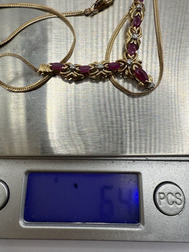 This fancy 10k gold Natural ruby and diamonds has a beauty to show Need a new home to enjoy wearing this fancy necklace Please scroll all pictures for weight and sizes