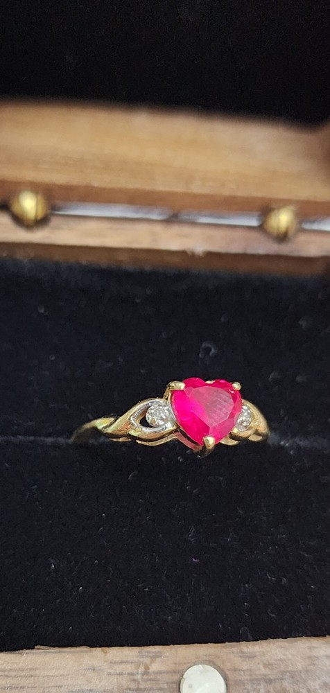 This 10k Yellow Gold Ring features a Ruby heart as the main stone with a prong setting and two diamond accents. The ring is vintage and has excellent cut grade, making it a stunning piece of fine jewelry. The combination of the red ruby and yellow gold create a vibrant and eye-catching design, perfect for any occasion. Total weight: 1.53 grams