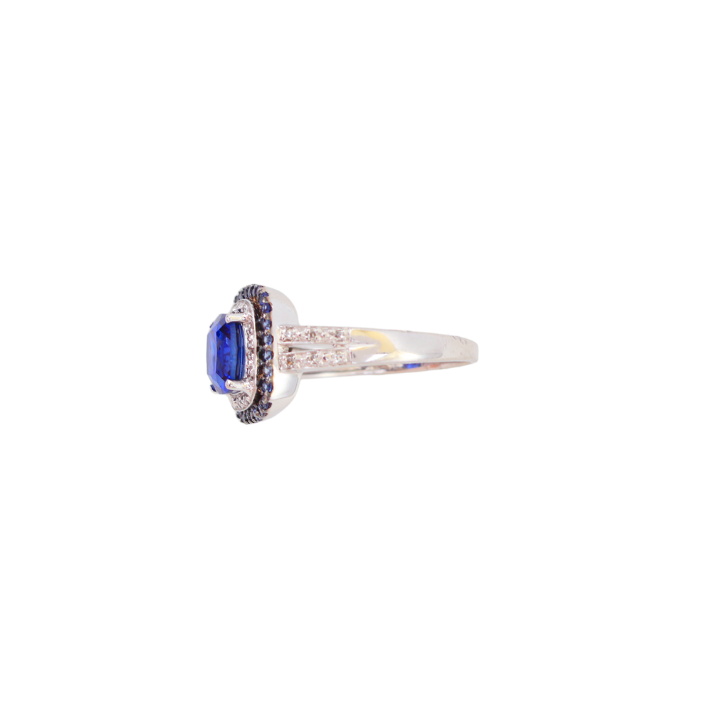 Beautiful 10k white gold ring featuring a stunning cushion-cut blue sapphire as the center stone, framed by an elegant double halo design. One halo sparkles with diamonds and delicate white gold beading, while the outer halo is accented with rich blue sapphires for added depth and contrast. The band has a graceful split-shoulder style adorned with diamond and beaded details for a refined finish. This piece has been professionally tested and certified as 10k gold, and the inside of the band is marked "10KT - FD". Measurements Ring size: apx. 7.5 Band width: apx. 1.6mm Main sapphire: apx. 7mm x 7mm Diamond weight: apx. 0.10 ct tw Total weight: apx. 3.53 grams Why Buyers Love This Style Cushion-cut sapphire centerpiece with vibrant deep blue color Double halo design adds brilliance and luxury presence Diamond accents and beaded detailing create a high-end look Perfect statement ring for special occasions or September birthstone wear 10k white gold sapphire ring cushion cut blue sapphire halo ring diamond accent ring double halo sapphire ring September birthstone jewelry beaded white gold ring split shoulder statement ring fine gemstone ring Item #2167