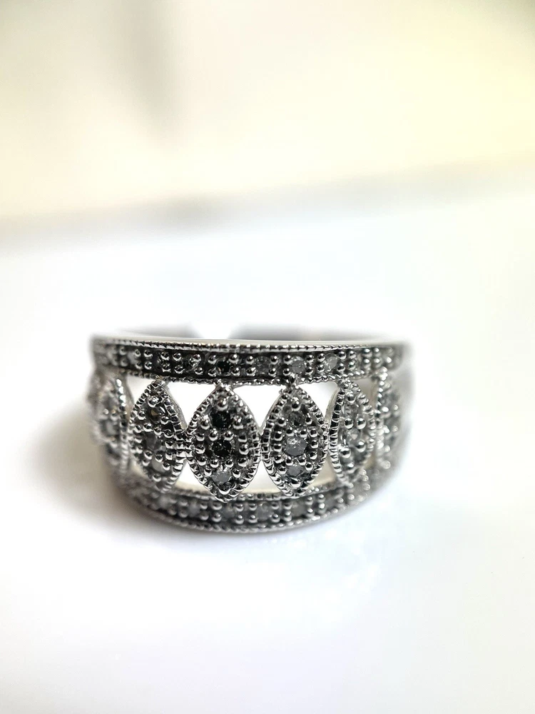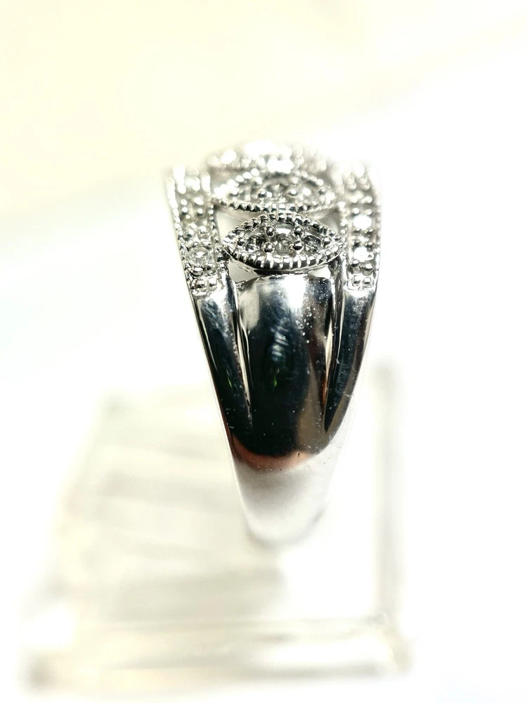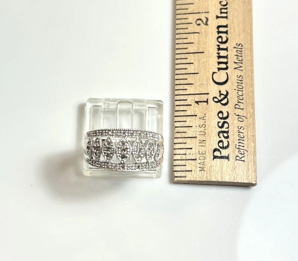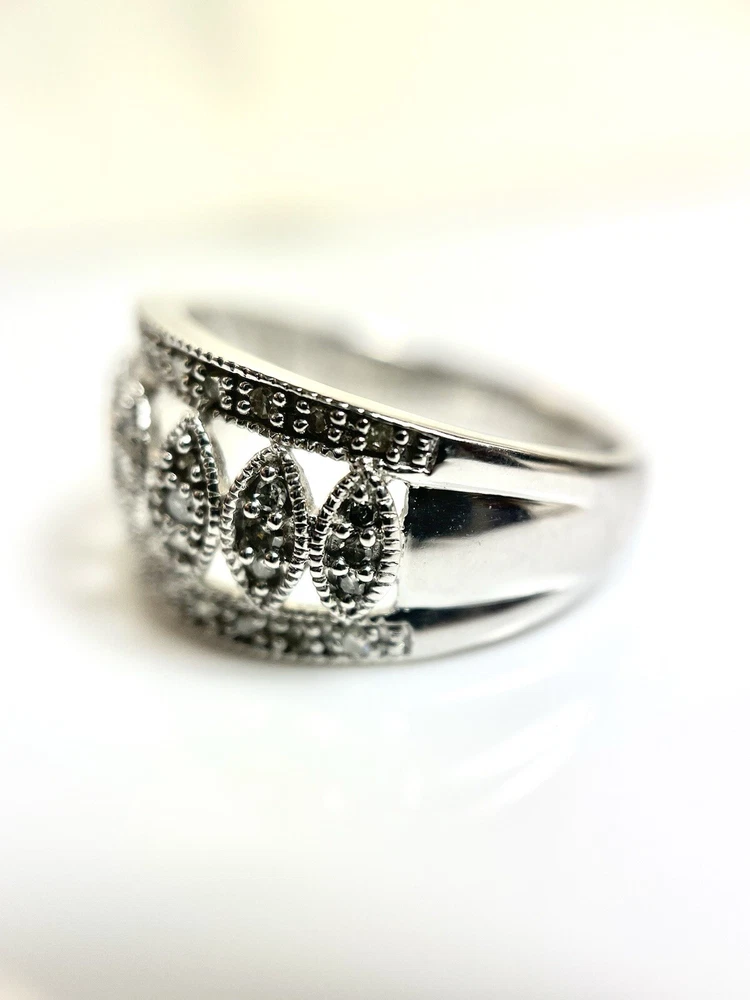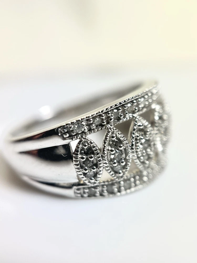 This stunning 10kt white gold ring is adorned with 43 sparkling natural diamonds, totaling .40ct in weight. The round diamonds are bead-set in a beautiful design, perfect for any occasion, whether it be a special event like a wedding or anniversary, or even just to show someone you care on Mother's Day. The ring is a size 7 and has a band width of 10.5. The diamonds in this ring have a J color grade and an included (I2) clarity grade. The main stone is white/near colorless and has a natural creation. This ring is made of 10k white gold, with a metal purity of .400. It is a perfect addition to any fine jewelry collection and is sure to make a statement. Ring weighs 4.2 grams.
