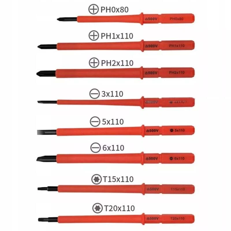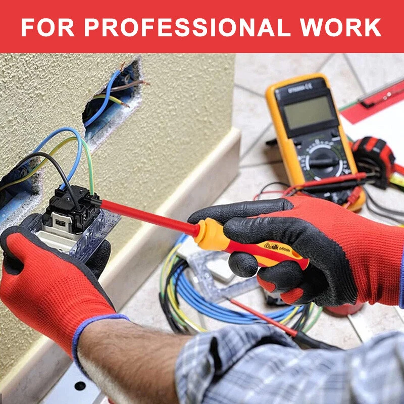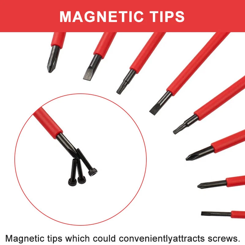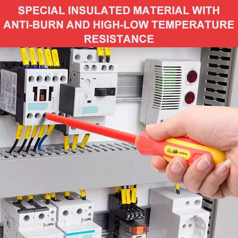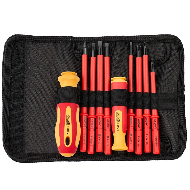 10-in-1 electrician insulated screwdriver set Product C haracteristics Safe To Use: Products through GS certification, insulation blade electrical application, to ensure 500 volts safe working standards. Non-Slip Handle For Comfortable Grip And Durability: The handle is made of abs material, new PP adhesive, good compression resistance, durable. The insulated grip is comfortable to grip and easy to control. The ergonomic design of the handle makes it easy to use. The small handle tip can be rotated so that you can use it with less effort. Chromium Vanadium Steel Cr_V Material Tool Head And Tool Holder: Chromium vanadium steel after heat treatment, high hardness, high wear resistance and good toughness, black polishing blade, magnetic tip, can be more convenient to adsorb screws. Small And Portable: Products carefully designed, easy to carry, separate storage, easy to take, suitable for a variety of use occasions. Product S pecification Status: 100% Brand New Quantity: 2 handles +8 poles Material: Chrome vanadium steel + TPR handle Handle Lenght 1: 4.53" / 115mm Handle Lenght 2: 3.98" / 101mm Bag Size(unfold): 10" x 7.09" / 255mm x 180mm Bag Size(fold): 7.09" x 3.5" x 1.85" / 180mm x 89mm x 47mm Slotted: 3 x 110mm, 5 x 110mm, 6 x 110mm Phillips: PH0 x 80mm, PH1 x 110mm, PH2 x 110mm Torx: T15 x 110mm, T20 x 110mm Package Included 3 x Slotted 3 x Phillips 2 x Torx 2 x Handle Please Note 1. Please allow manual measurement error of 1-3mm. Make sure you don't mind before you buy. 2.There may be some slight differences in the hue of the picture and the actual item due to lighting effects, brightness contrast Settings of the monitor, etc. Make sure you don't mind.