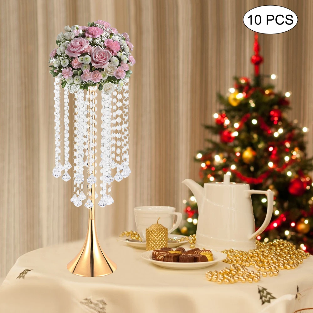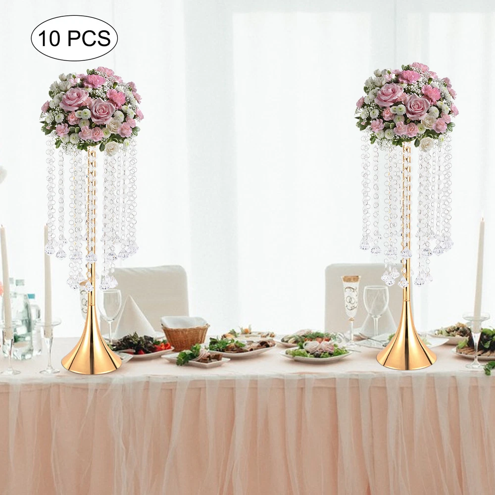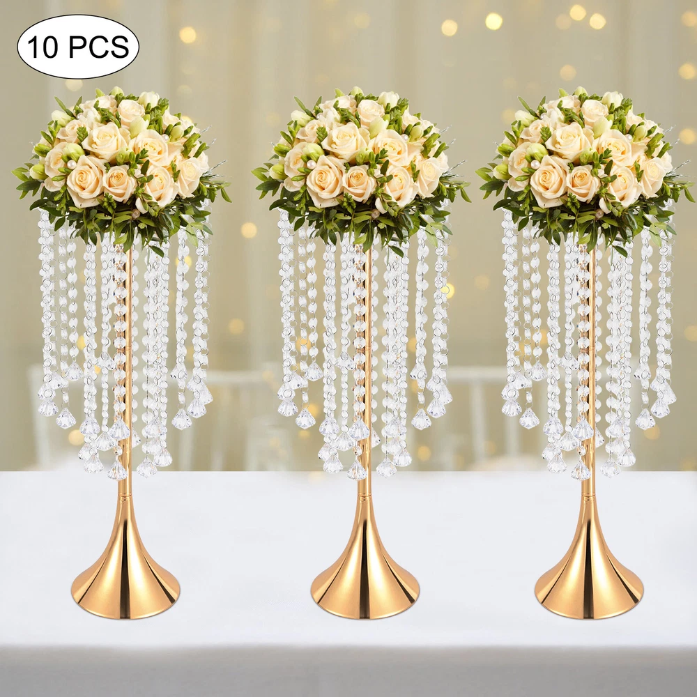 Specification Color: Gold Shape: Trumpet Treatment: Electroplating, Polishing, Hand-strung, Drilling, Welding Material: Iron, Acrylic Beads Style: Romantic, European Number of Pieces: 10 Assembly Required: Yes Installation Type: Centerpieces, Tabletop Number of acrylic Pendants: 24 Number of Octagonal Beads: 16 (Inner Ring), 12 (Outer Ring) Top Diameter: 20cm/7.9inch (Each) Base Diameter: 14.2cm/5.6inch (Each) Flower Vase Height: 55.6cm/21.9inch (Each) Package Size: 35*35*25cm/13.78*13.78*9.84inch Net Weight: 11kg/24.25lbs Gross Weight: 12.5kg/27.55lbs Package Included 10Pcs* Crystal Flower Vases All Accessories for Assembly 10pcs Crystal Flower Vases Golden Flower Stand Wedding Table Centerpieces Decor Description If you need some great flower vases to build a romantic wedding, a creative party, or a fantastic celebration, our product will be your best choice. Equipped with acrylic pendants with hand-strung beads, this flower vase can spice up the dull decor and create an eye-catching and dreamy atmosphere. And it uses high-quality iron and acrylic material with various processes such as electroplating, making it durable and reusable. Key Features Durable and Reusable: Each flower vase is made of high-quality iron with various exquisite processes such as electroplating, polishing, drilling, and welding, making it hard, durable, and reusable. Hand-strung Beads: The natural dangling of these hand-strung, elaborate beads adds so much beauty and elegance to the vase, showing your guests your elegant taste. Elegant Appearance: Its trumpet shape design, simple and smooth streamlines, and charming crystal beads present its uniqueness, novelty, creativity, and delicacy, adding an extra aestheticism to the scenes you need to decorate. Fascinating Backdrop: The acrylic crystal beads design can present a shimmering effect and spice up the dull decoration, especially under the sunshine or light, making it ideal for displaying as a fabulous backdrop for weddings, birthday parties, and other occasions. Easy to Assemble: For its simple structure and all accessories we provide, you can assemble this product easily and quickly. Easy to Clean: Due to its iron material with polishing and electroplating process, you can use a soft cloth to clean and dry, which is very simple. Easy to Store: Due to the segmented design and 24.25 lbs of total weight, these flower vases are easy to carry and store. Buy with Confidence: We aim to provide high-quality products and services. If you have any problems, please feel free to contact us. We will reply and solve the problem for you as soon as possible. Detail Top Flower Plate: The top flower plate is designed with two circles and three bars, together with drilling and welding processes, making it stable and unique. Stable Base: Its enlarged trumpet-shaped base has a diameter of 5.6 inches with good stability so that the entire vase firmly on the ground even if there are many flowers on it. Application These flower vases are suitable for wedding aisle decors, wedding receptions, event centerpieces, lower road leads, and daily home decoration. You can use them for housewarming, anniversaries, birthdays, weddings, engagements, etc. Specification Color: Gold Shape: Trumpet Treatment: Electroplating, Polishing, Hand-strung, Drilling, Welding Material: Iron, Acrylic Beads Style: Romantic, European Number of Pieces: 10 Assembly Required: Yes Installation Type: Centerpieces, Tabletop Number of acrylic Pendants: 24 Number of Octagonal Beads: 16 (Inner Ring), 12 (Outer Ring) Top Diameter: 20cm/7.9inch (Each) Base Diameter: 14.2cm/5.6inch (Each) Flower Vase Height: 55.6cm/21.9inch (Each) Package Size: 35*35*25cm/13.78*13.78*9.84inch Net Weight: 11kg/24.25lbs Gross Weight: 12.5kg/27.55lbs Package Included 10Pcs* Crystal Flower Vases All Accessories for Assembly Notes 1.Please note that flower balls are not included. 2.To extend its service life, do not use abrasives for cleanup. You can use a soft cloth to clean and dry. 3.Please allow the slight color difference caused by the shooting light and the 1-3cm error due to manual measurement. Please make sure you do not mind before you order. Payment Delivery details Terms of sales About us Contact us Payment We accept ebay payment 。 Fees such as import duties, taxes are not included in the item price or shipping costs. These charges are the buyer's responsibility. Delivery details Shipping: 2-9 working days to: USA Terms of sales We maintain high standards of excellence and strive for hundred percent customer satisfaction. Feedback is very important to us. We hope that you contact us immediately before you give neutral or negative feedback, so that we can address your concerns. It is impossible to address issues if we do not know about them! About us Your satis faction is our ultimate goal. We work hard to earn your trust and future business. Our certified technicians have tested each item before shipping. The unit comes with 1 year limited warranty on all manufacturing defects. a) If you receive a defective item, you may return it or ask for a discount. Please contact us within 14 days after you receive the package. b) What you returned must be intact and in its original packaging as re? u. Customer is responsible for shipping costs of the returned item. c) We will cover the cost of shipping back t with the shipping rate indicated in the registration page. We will send you a new unit or refund the full payment you paid. Thank you. Contact us Business Hour Business Hour: Monday To Friday: 8:30 AM to 5:00 PM (Beijing China time) Due to time zones, our reply to your questions may not be immediately. But within above working time, we will reply your email within 24 hours. If it's non-workdays, please kindly be patient and wait till Monday. Please contact us with ebay message. Please feel free to contact us if you have any questions. Monday To Friday: 8:30 AM to 5:00 PM (Beijing China time) Due to time zones, our reply to your questions