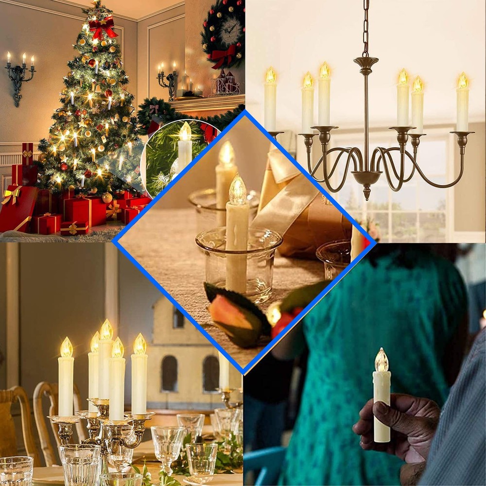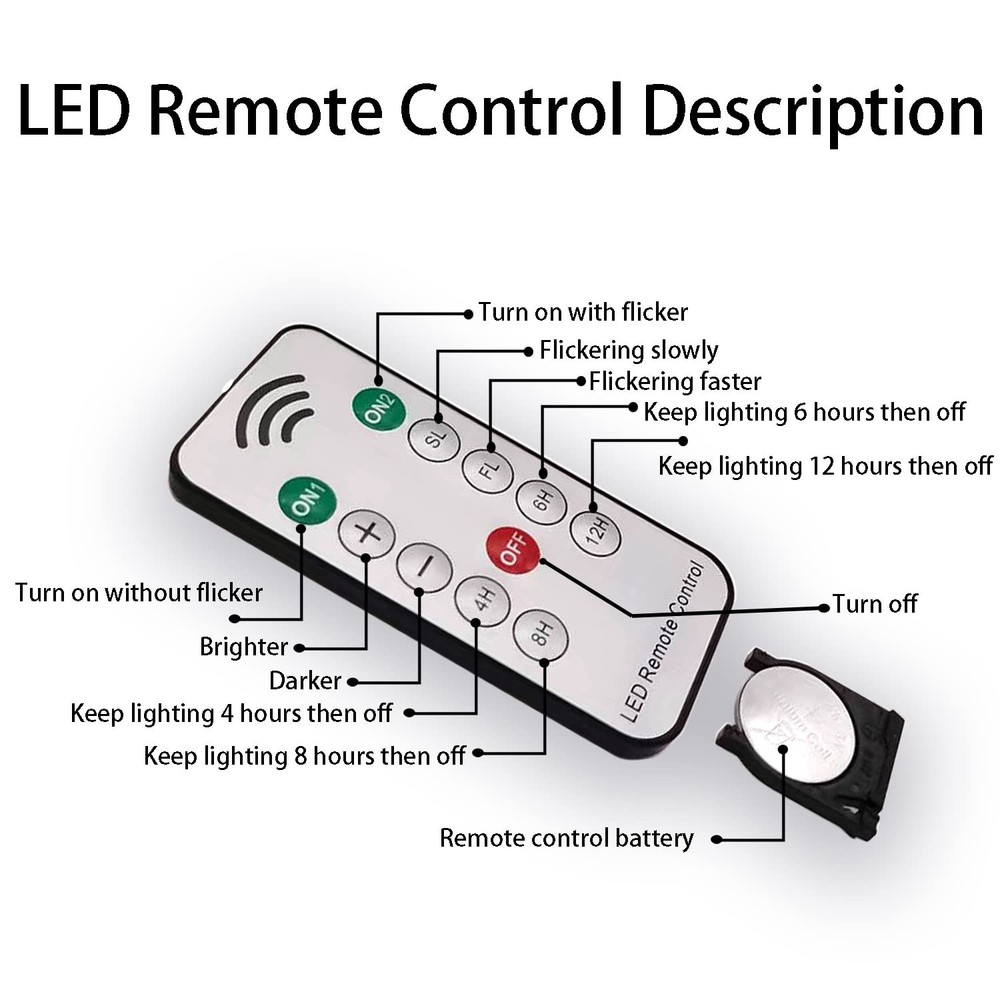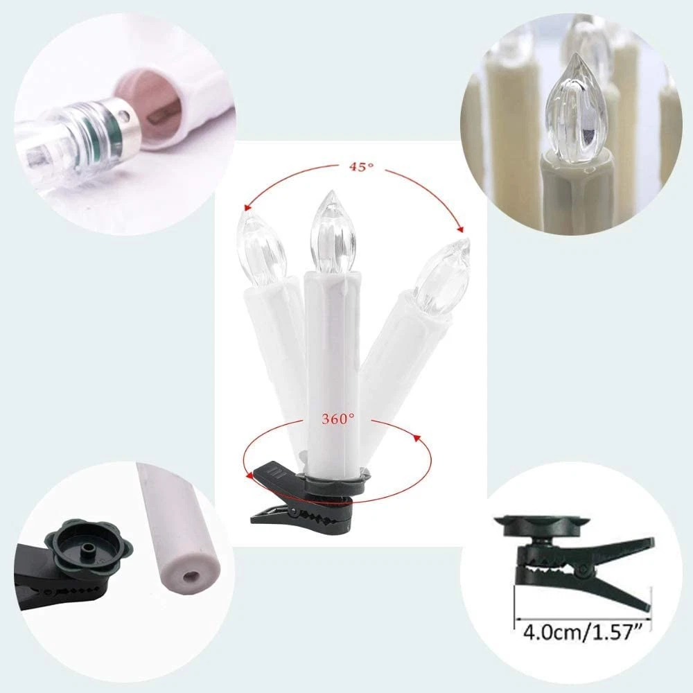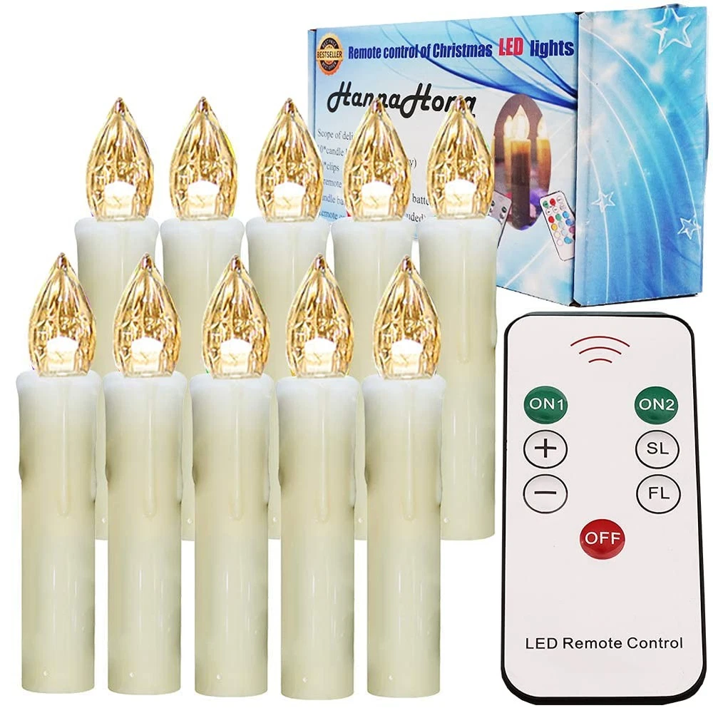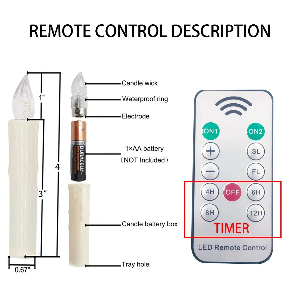 Color:10pcs,wram White Lights Description: These flameless candles can be used indoors or outdoors. Enjoy the mood without the messy wax and dangerous flames as well as the convenience of the remote control and timer. The bulbs are made in LED, which is safe and energy-efficient and they change colors, too. This is perfect for those nights when you want to relax and de-stress. Give you the feeling of real candles without worrying about dripping, fires, etc. Specification ●Material: Plastic and ABS ● Flash mode: Flicker Flame ● Work time: 140 hours ●LED color: Warm White Flicker ●Battery: 1xAA batteries (not included) ●Remote battery: 1-CR2025 (included) ●Diameter: 0.7 inches ●Length: 4 inches Details 1. On1/ON2 and Off buttons: Press "ON1/ON2" /"OFF" button to turn the candle on /off. 2. Press "On1", the candle is flickering, the color changing,and it will be stopped after continuously pressing "On1" three seconds. 3. Press "On2", the candle is not flickering, the color changing, then press"SL" makes the candle flicker, it can be stopped after press "On2" again. 4."+": Press it makes the light brighter 5."-": Press it makes the light darker 6."SL": Press it makes the light slow flickering 7."FL": Press it makes the light fast flickering Package includes: 10 x Flameless Candles (batteries not included), 1 x remote control (battery included), 10 x clips 【LONG LASTING/SAVE BATTERY】 Each candle requires 1x AA replaceable batteries(NOT included) that will provide up to 180 hours(10-15 days) light-time and can be replaced easily.It saves your money on batteries. A great way to enjoy the gorgeous candlelight. 【REMOTE CONTROL/DIMMABLE AND FLICKERING】 THE Candles have a Flicker(Fast and Slow) and You can control the Brightness(Increase and Decrease) by the remote.Candle gives you a REALISTIC APPEARANCE without the smoke,fake scent or messy dripping wax! 【PERFECT for DECORATION】 These battery operated led Christmas candles light can be used to create a joyful and festive ambience. They are perfect for home, Christmas parties, holidays, Thanksgiving, Harry Potter themed parties, indoor and outdoor decorations. 【WIDELY USE with HIGH QUALITY CLIPS】The candles come with removable clips for each which can attach them to a Christmas tree,Chandeliers,Swedish Candelabra, wreaths,tealight or other object.They can be widely applied to Christmas, wedding, party, thanksgiving. 【SAFE and BEAUTIFUL】 The candles are Energy saving, smoke free, zero carbon emission and without having to worry of flame. Absolutely no fire hazards or burning risks, safe for families with pets or young children.They can create warm and romantic atmosphere, which can give you a magic world, and bring a breathable design into your home's warm environment.