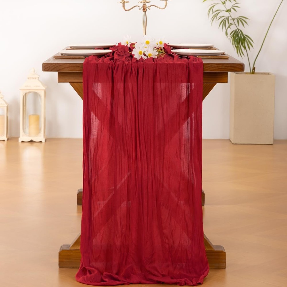 Cheesecloth Table Runner Size:35" W x 120" L. This versatile runner is designed to fit most tables, chairs, and wedding arches. Material: High quality cheesecloth. Soft, rustic and durable. Hand-dyed from natural material. The edges are carefully stitched and can prevent fraying to keep an elegant and flowing condition. Variety of Occasions: suitable for home decor, outdoor events and uses, formal and informal setting in all seasons. This soft cheesecloth table runner is perfect for wedding party, baby shower, bridal party, Valentine's Day, Easter, Thanksgiving, Christmas, New Year's Day, tea party, anniversary, holiday and other special events. Note: Machine wash in a laundry bag or hand wash. No ironing required to maintain wrinkled texture. these instructions and the table runner will not fade or shrink after washing.