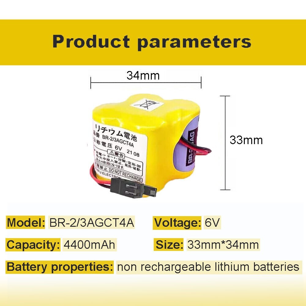 Specification: Model: BR-2/3AGCT4A/A98L-0031-0025 Voltage: 6V Capacity: 4400mAh Size: 33MM*34MM*34MM Nature: Non-rechargeable disposable lithium battery Utilization period: 10 years Application: Real-time clock, alarm system, PLC backup memory power supply, FANUC FANUC numerical control system, CNC numerical control battery, servo motor, machine tool equipment, various measuring instruments, special electronic equipment, etc. Special lithium batteries for electronic products. Main advantages : High voltage, high energy density, long service life, stable discharge, high current discharge performance, wide application temperature range (-40 to +85 degrees Celsius), no leakage. Replace for: A98L-0031-0025, A98L00310025, BR-2/3AGCT4A, BR2/3AGCT4A Battery Package included : 10 Pack BR-2/3AGCT4A Lithium battery