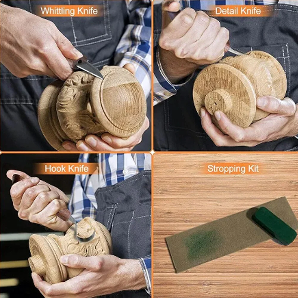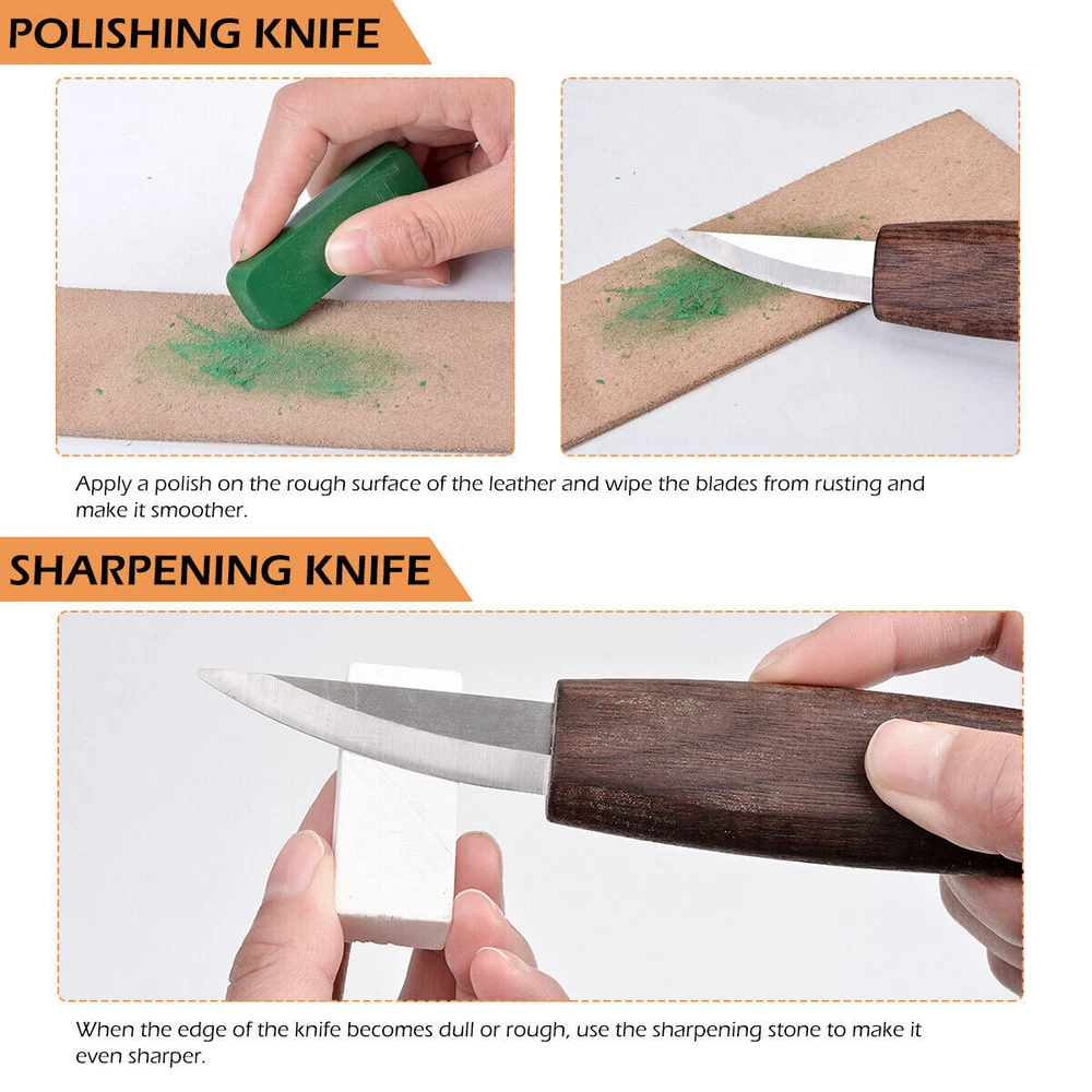 *Function: Widely used for polishing work with the polishing wheel, or for straight razor together with leather straight handle razor. *Various uses: very suitable for polishing gold, silver, brass, copper, aluminum, knife, etc. *Make the tool more durable: the slurry used for high-precision polishing effectively prolongs the service life of the tool. *Simple operation: just apply the polishing paste on the whetstone, drip a few drops of engine oil for lubrication, and then start grinding. *Lightweight and easy to grip: This knife polishing agent is lightweight. Therefore, it is easy to hold and use on green wood. *Easy to grip: The compact design makes it easy to grip when applied to polishing wheels. Specification: Material: Chrome vanadium alloy steel + wood Hook Knife: Hand shank length 103mm, Knife length 29mm The detail knife: Hand shank length 128mm, Knife length 50mm The straight knife: Hand shank length 103mm, Knife length 60mm Color: As shown the picture Packing included: 1 x Peeling cutter (flat handle) 1 x Curved cutter(flat handle) 1 x Universal cutter(flat handle) 1 x Knife stone 1Pair x Gloves 1 x Sharpener 1 x Wax 1 x Bag 1 x Model 4 cutter 1 x Model 2 cutter Note: 1. Please allow 1-3cm (0.4-1.18") difference due to manual measurement and slight color variation for different display setting. 2. Due to the light and screen difference, the item's color may be slightly different from the pictures. Please understand. On Sep 13, 2023 at 04:14:34 PDT, seller added the following information: On Jul 21, 2024 at 19:26:59 PDT, seller added the following information:
