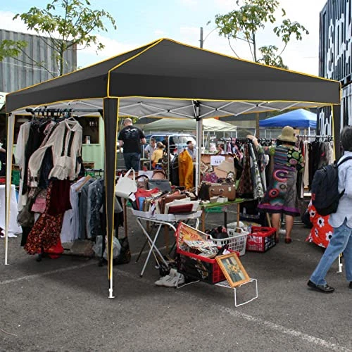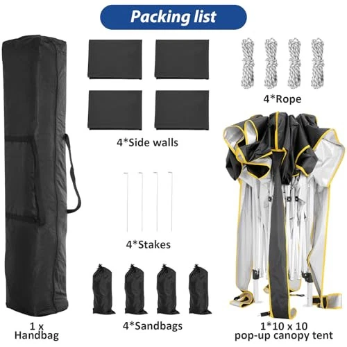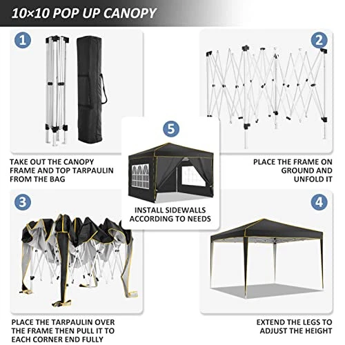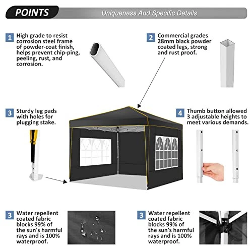 Improved metal frame: 10x10 pop up canopy has an improved, thickened metal frame, the metal legs reach a thickness of 25x20 mm and are provided with an anti-rust coating. Waterproof fabric: The outer fabric of the canopy tent 10x10 is made of waterproof, silver-plated 210D Oxford cloth, which is effectively waterproof and can effectively block 99% of harmful sunlight, UPF 50+. Easy to assemble: No tools are required, just 1-2 people can set up this 10x10 pop up canopy with sidewalls in a few minutes. Canopy tent has three adjustable heights: 230(90.4) - 240(94.4) - 250(98.4)cm(inch). List of items: 10x10 ft canopy foldable frame, waterproof outer fabric, 4 side panels (2 with zippers + 2 with windows), 4 sandbags, 4 pegs, 4 ropes and 1 carrying bag. Service & Various uses: 10x10 pop up canopy comes with a one-year warranty. If you have any questions or issues, please feel free to contact us at any time. Suitable for parties, gatherings, beaches, festivals, trade fairs, camping, weddings, events and many other occasions. The pop up canopy 10x10 can protect you from sun and rain.