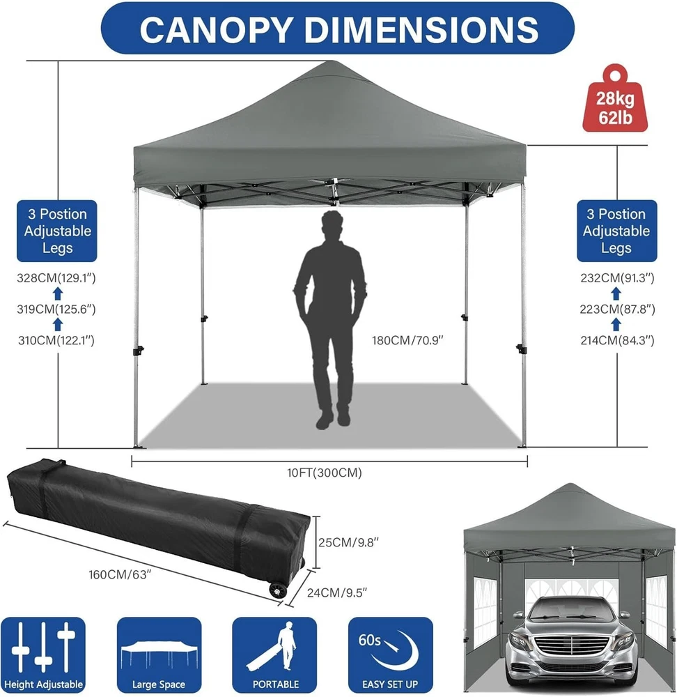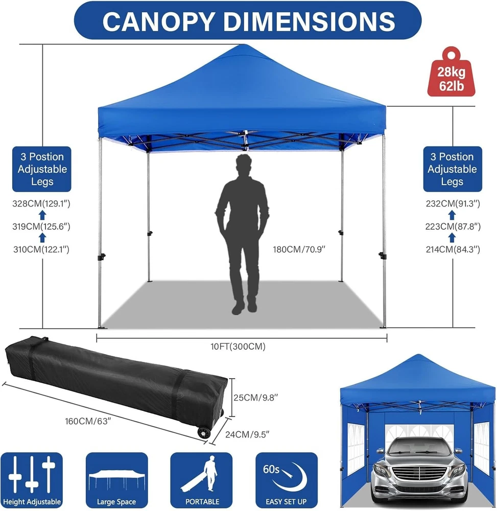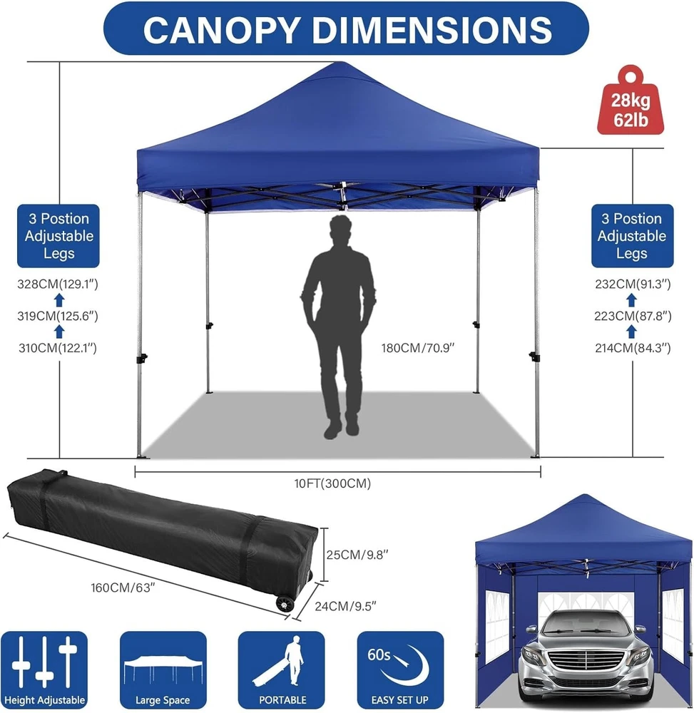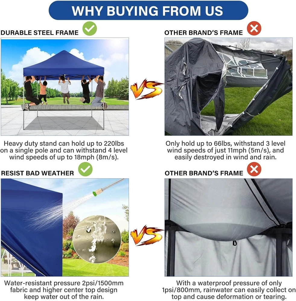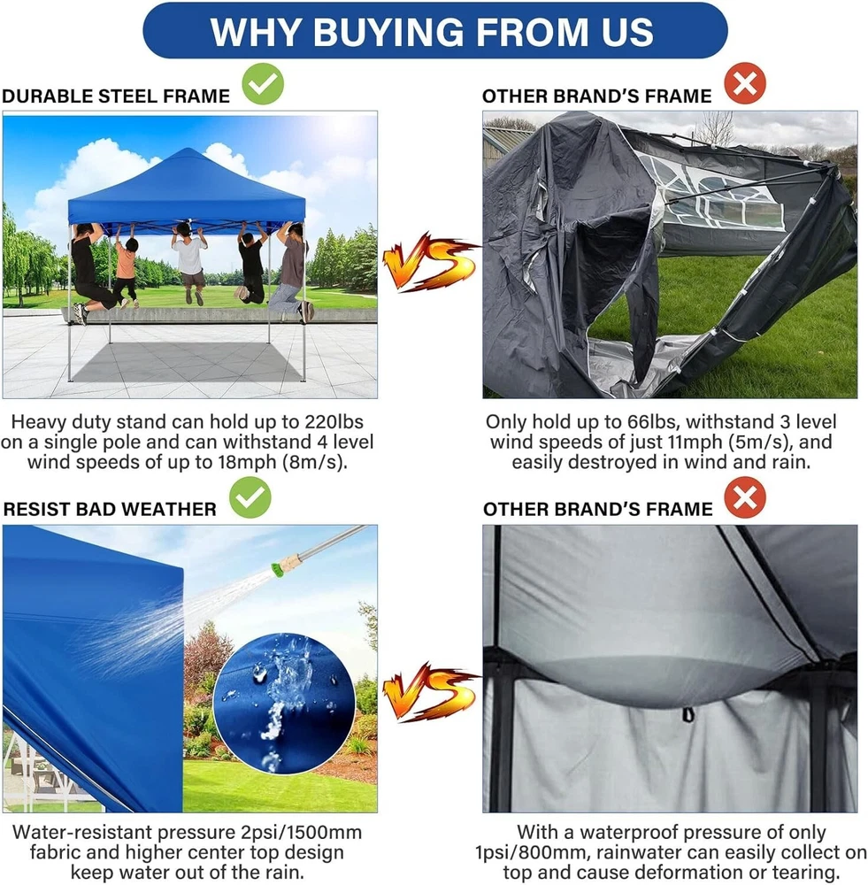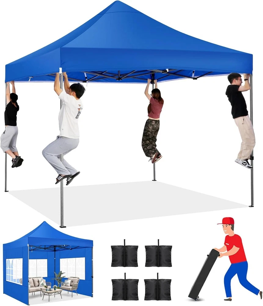 Product Description About this item 【Heavy Duty Upgraded Frame】The frame of 10x10 Pop Up Canopy Tent is commercial grade full truss construction made of durable powder coated stainless steel. 32mm/1.26 inch widened pipe diameter, 0.7mm/0.03 inch thickened wall thickness, Stronger and more stable than other normal gazebos on the market. The middle support pole structure can hold up to 220 lbs on a single pole and can withstand up to level 4 wind (18mph), using the included sandbags, ropes and nails for increased carport stability. 【Best Quality Fabric and Sidewalls】10x10 Heavy duty canopy tent is made of 500D Oxford cloth with two layers of PU coating, UPF 50+, blocks 99% of UV rays. Heat-sealed seam technology is used, 100% waterproof, 1500mm waterproof pressure, waterproof effect is better than other general tents. 4 PU coated sidewalls connected by a whole strip of hook and loop fastener and zipper to attach to the frame top and legs for securing, removable, you can install as many sidewalls as you want. 【Easy Set up, 3 Adjustable Heights】2-3 people can easily set up and take down 10x10 outdoor party tent canopy in minutes without tools, it can easily accommodate 10-15 people. Just remove the fully assembled frame and top from bag, place fabric over frame, stretch legs, and you're done. Wedding tent gazebo is available in 3 different heights (84.3'', 87.8'', 91.3'') for your choice to ensure adequate headspace. Best thumb latch system is easy to lock and release without pinching your fingers. 【Portable Durable Roller Bag】Since 10x10 heavy duty pop up canopy tent with sidewalls has a weight of 62 lbs, we offer you a solid and durable 600D Oxford cloth PVC coated roller bag. It has 2 big removable solid rubber wheels and reinforced handle for easy movement and transportation. Tents for parties, weddings, BBQ, trade shows, sporting event, disaster relief or any outdoor event. Waterproof canopy gazebo are commonly used in commercial areas, playgrounds, patios, gardens, farms, gyms, etc. 【WHAT'S INCLUDED】1x Commercial grade 10x10 Pop up Tent Frame, 1x 10'x10' Canopy Top Cover, 4x PU Coated Panels (3x Sidewalls with Window and 1x Sidewalls with Zipper), 4x 420D Oxford cloth PVC coated Sandbags, 8x Ground Pegs, 4x Wind Ropes, 1x Roller bag, 1x Manual. If you have any questions and doubts, please feel free to contact us, we will give you the best help. Choosing us means choosing a comfortable life.