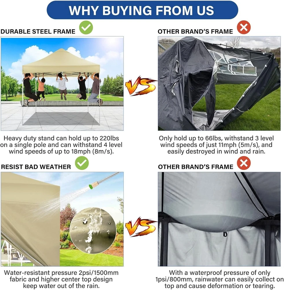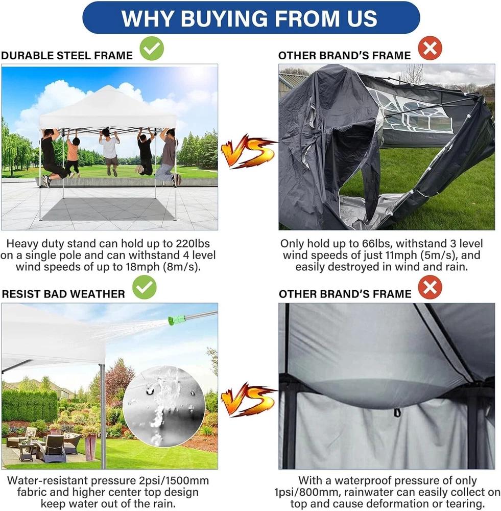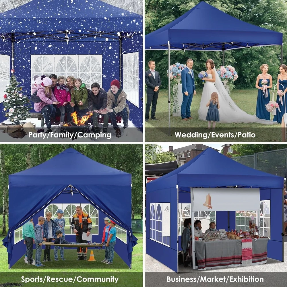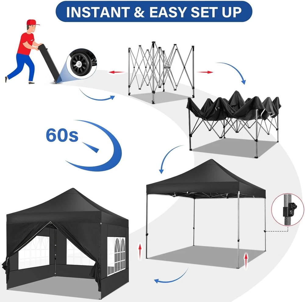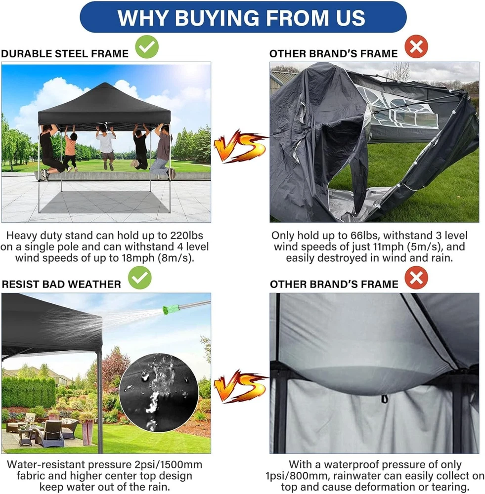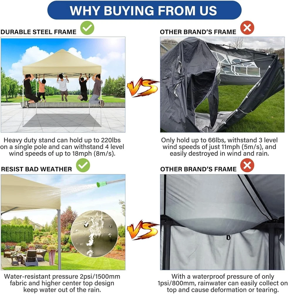 Product Description About this item 【Heavy Duty Upgraded Frame】The frame of 10x10 Pop Up Canopy Tent is commercial grade full truss construction made of durable powder coated stainless steel. 32mm/1.26 inch widened pipe diameter, 0.7mm/0.03 inch thickened wall thickness, Stronger and more stable than other normal gazebos on the market. The middle support pole structure can hold up to 220 lbs on a single pole and can withstand up to level 4 wind (18mph), using the included sandbags, ropes and nails for increased carport stability. 【Best Quality Fabric and Sidewalls】10x10 Heavy duty canopy tent is made of 500D Oxford cloth with two layers of PU coating, UPF 50+, blocks 99% of UV rays. Heat-sealed seam technology is used, 100% waterproof, 1500mm waterproof pressure, waterproof effect is better than other general tents. 4 PU coated sidewalls connected by a whole strip of hook and loop fastener and zipper to attach to the frame top and legs for securing, removable, you can install as many sidewalls as you want. 【Easy Set up, 3 Adjustable Heights】2-3 people can easily set up and take down 10x10 outdoor party tent canopy in minutes without tools, it can easily accommodate 10-15 people. Just remove the fully assembled frame and top from bag, place fabric over frame, stretch legs, and you're done. Wedding tent gazebo is available in 3 different heights (84.3'', 87.8'', 91.3'') for your choice to ensure adequate headspace. Best thumb latch system is easy to lock and release without pinching your fingers. 【Portable Durable Roller Bag】Since 10x10 heavy duty pop up canopy tent with sidewalls has a weight of 62 lbs, we offer you a solid and durable 600D Oxford cloth PVC coated roller bag. It has 2 big removable solid rubber wheels and reinforced handle for easy movement and transportation. Tents for parties, weddings, BBQ, trade shows, sporting event, disaster relief or any outdoor event. Waterproof canopy gazebo are commonly used in commercial areas, playgrounds, patios, gardens, farms, gyms, etc. 【WHAT'S INCLUDED】1x Commercial grade 10x10 Pop up Tent Frame, 1x 10'x10' Canopy Top Cover, 4x PU Coated Panels (3x Sidewalls with Window and 1x Sidewalls with Zipper), 4x 420D Oxford cloth PVC coated Sandbags, 8x Ground Pegs, 4x Wind Ropes, 1x Roller bag, 1x Manual. If you have any questions and doubts, please feel free to contact us, we will give you the best help. Choosing us means choosing a comfortable life.